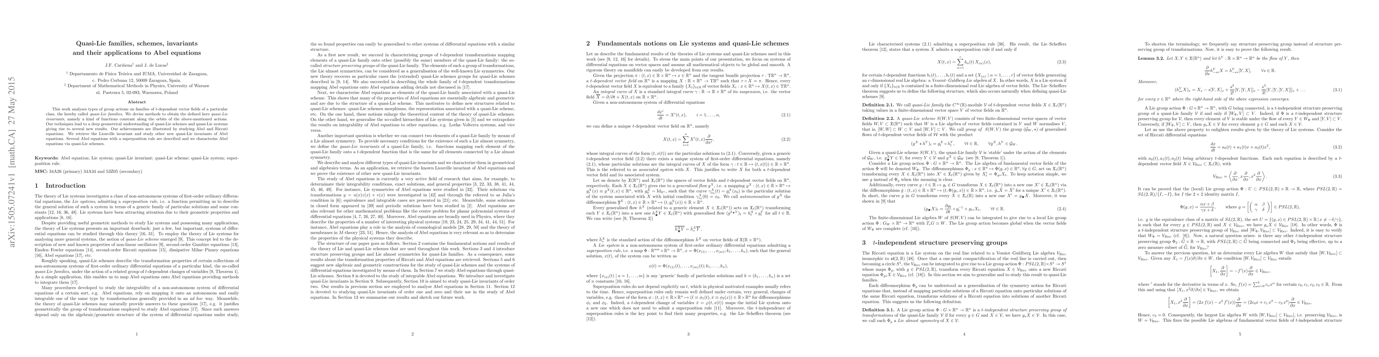 This work analyses types of group actions on families of $t$-dependent vector fields of a particular class, the hereby called quasi-Lie families. We devise methods to obtain the defined here quasi-Lie invariants, namely a kind of functions constant along the orbits of the above-mentioned actions. Our techniques lead to a deep geometrical understanding of quasi-Lie schemes and quasi-Lie systems giving rise to several new results. Our achievements are illustrated by studying Abel and Riccati equations. We retrieve the Liouville invariant and study other new quasi-Lie invariants of Abel equations. Several Abel equations with a superposition rule are described and we characterise Abel equations via quasi-Lie schemes.