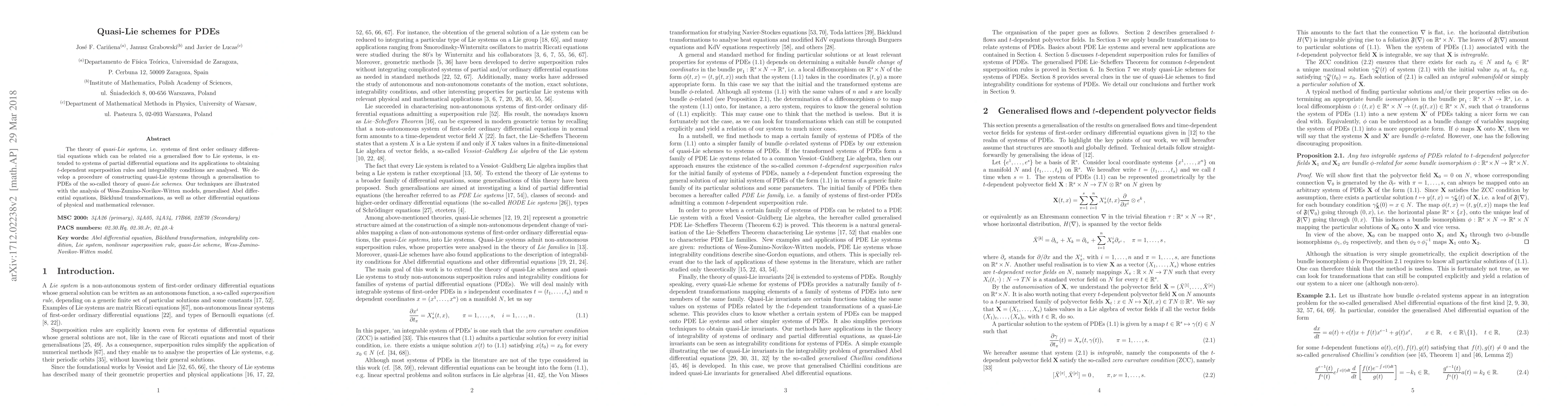 The theory of quasi-Lie systems, i.e. systems of first order ordinary differential equations which can be related via a generalised flow to Lie systems, is extended to systems of partial differential equations and its applications to obtaining $t$-dependent superposition rules and integrability conditions are analysed. We develop a procedure of constructing quasi-Lie systems through a generalisation to PDEs of the so-called theory of quasi-Lie schemes. Our techniques are illustrated with the analysis of Wess-Zumino-Novikov-Witten models, generalised Abel differential equations, Baecklund transformations, as well as other differential equations of physical and mathematical relevance.