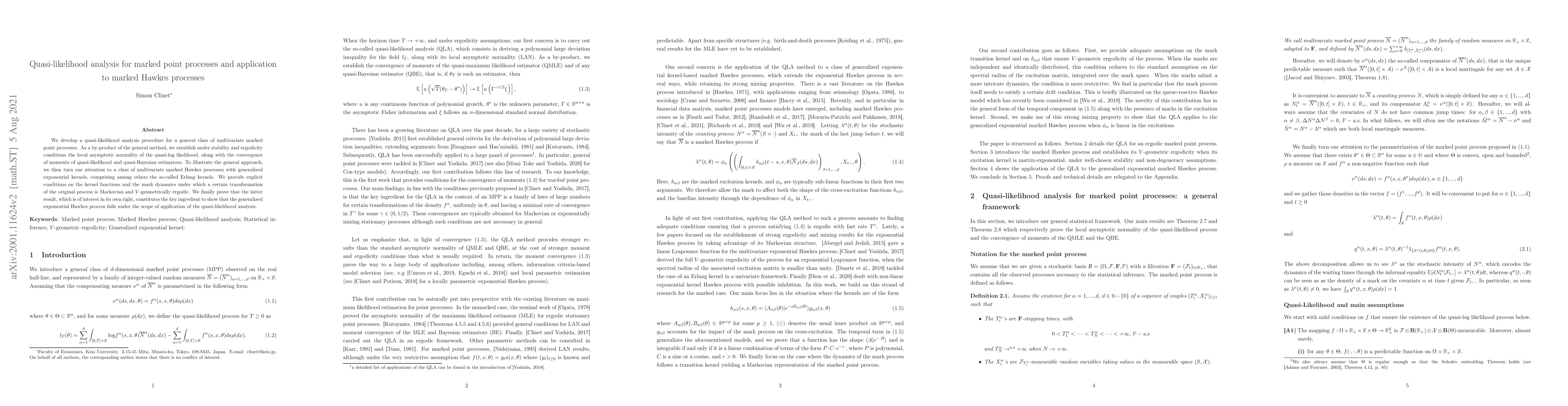 We develop a quasi-likelihood analysis procedure for a general class of multivariate marked point processes. As a by-product of the general method, we establish under stability and ergodicity conditions the local asymptotic normality of the quasi-log likelihood, along with the convergence of moments of quasi-likelihood and quasi-Bayesian estimators. To illustrate the general approach, we then turn our attention to a class of multivariate marked Hawkes processes with generalized exponential kernels, comprising among others the so-called Erlang kernels. We provide explicit conditions on the kernel functions and the mark dynamics under which a certain transformation of the original process is Markovian and $V$-geometrically ergodic. We finally prove that the latter result, which is of interest in its own right, constitutes the key ingredient to show that the generalized exponential Hawkes process falls under the scope of application of the quasi-likelihood analysis.