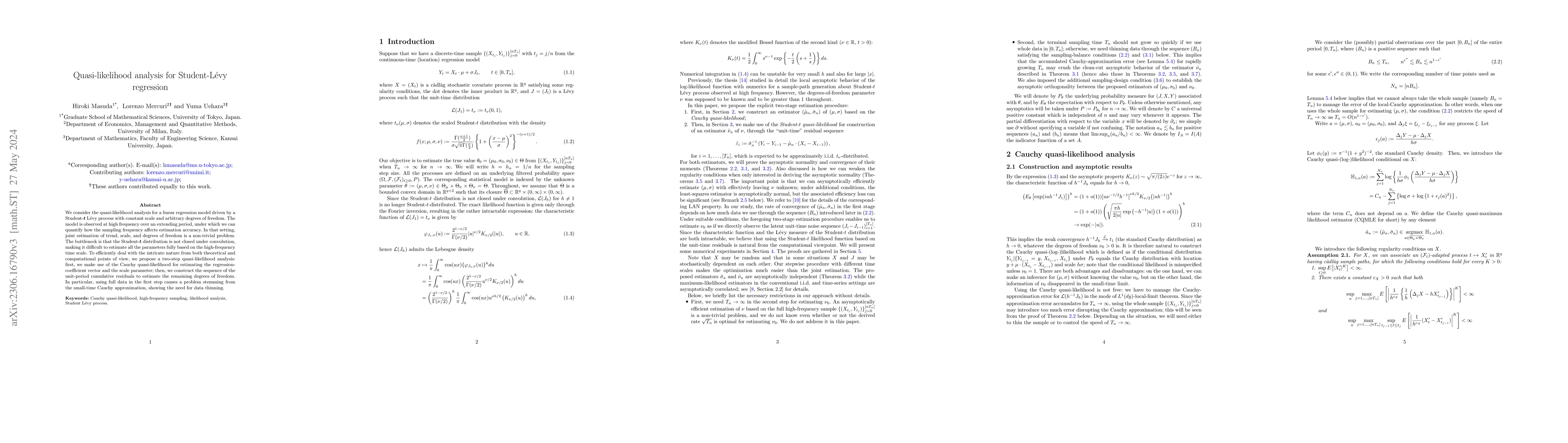 This paper proposes a quasi-likelihood analysis for a linear regression model driven by a Student-t Lévy process, tackling the non-trivial joint estimation of trend, scale, and degrees of freedom due to the convolution issue of the Student-t distribution. The authors introduce a two-step quasi-likelihood method: first using Cauchy quasi-likelihood for initial estimation, followed by data-thinning and cumulative residuals for final parameter estimation.