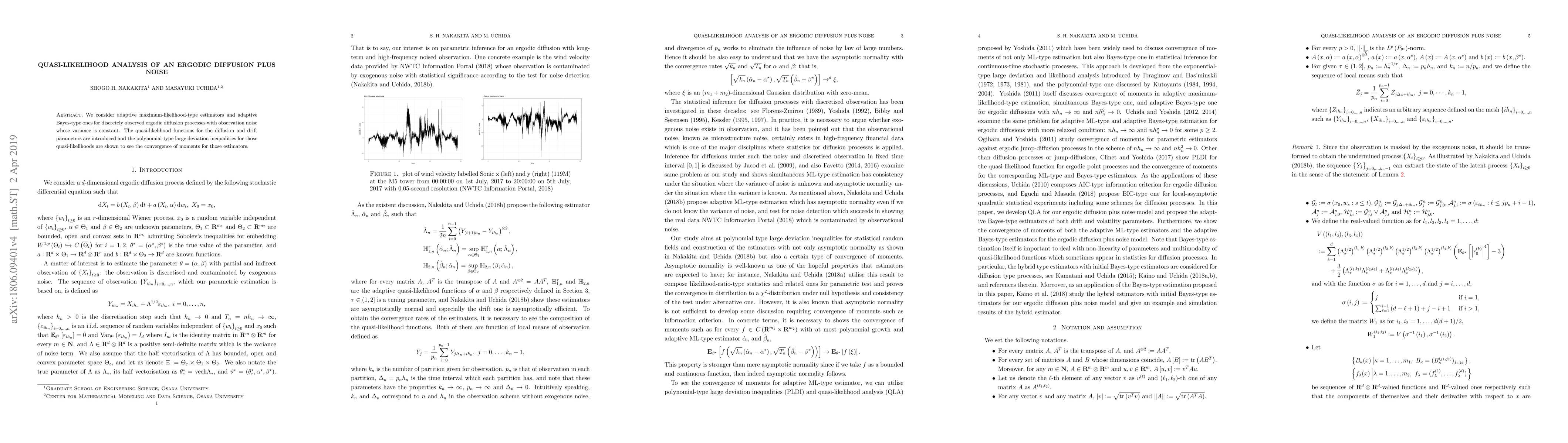 This paper develops adaptive maximum-likelihood and Bayes-type estimators for ergodic diffusion processes with constant observation noise, introducing quasi-likelihood functions for diffusion and drift parameters and proving polynomial-type large deviation inequalities for convergence of moments of these estimators.