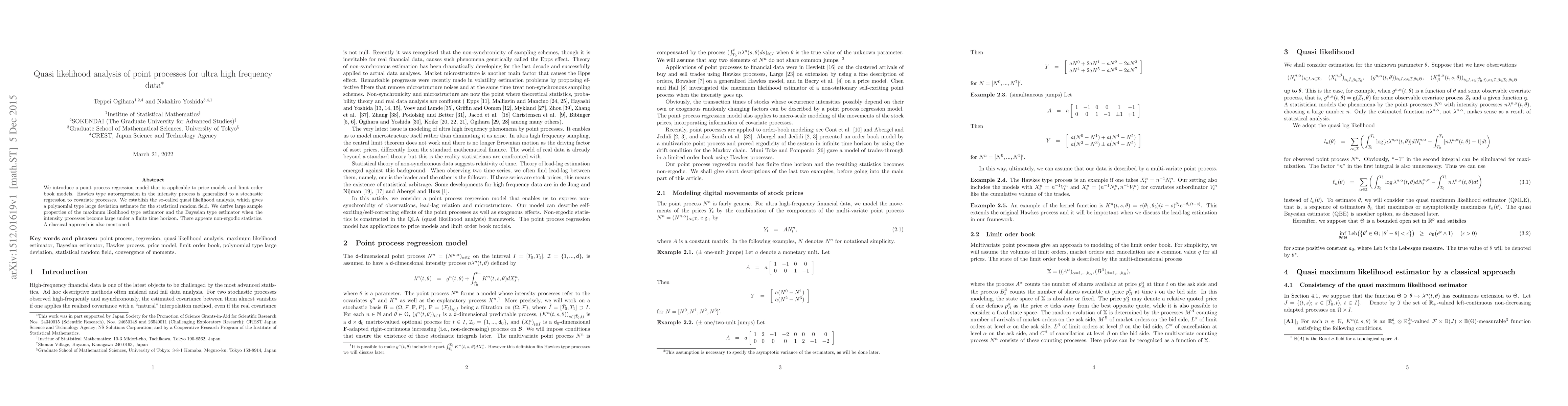 We introduce a point process regression model that is applicable to price models and limit order book models. Hawkes type autoregression in the intensity process is generalized to a stochastic regression to covariate processes. We establish the so-called quasi likelihood analysis, which gives a polynomial type large deviation estimate for the statistical random field. We derive large sample properties of the maximum likelihood type estimator and the Bayesian type estimator when the intensity processes become large under a finite time horizon. There appears non-ergodic statistics. A classical approach is also mentioned.