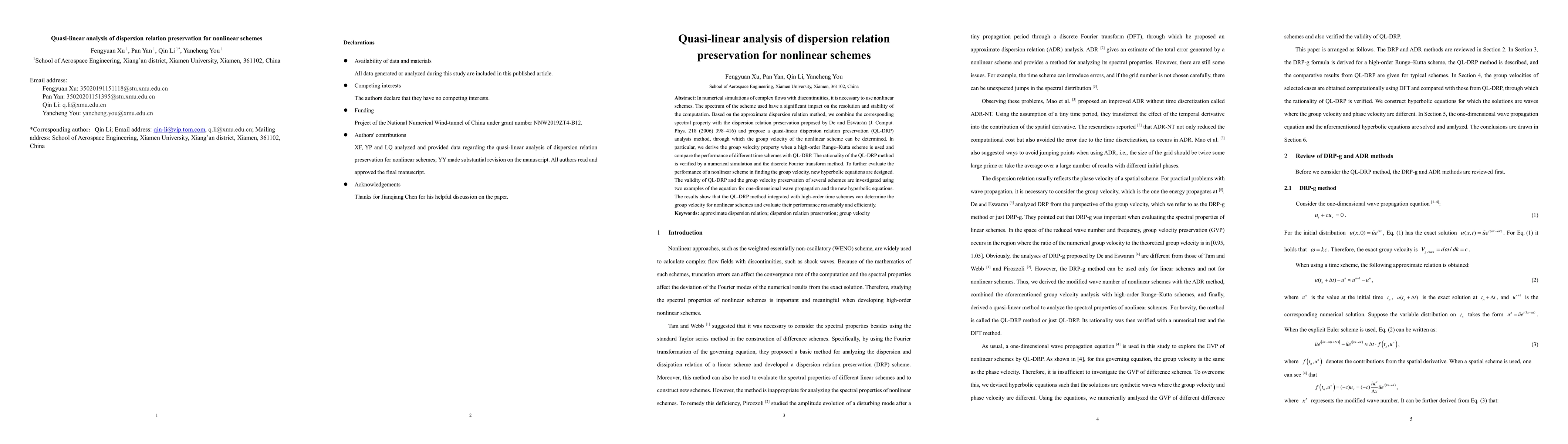 In numerical simulations of complex flows with discontinuities, it is necessary to use nonlinear schemes. The spectrum of the scheme used have a significant impact on the resolution and stability of the computation. Based on the approximate dispersion relation method, we combine the corresponding spectral property with the dispersion relation preservation proposed by De and Eswaran (J. Comput. Phys. 218 (2006) 398-416) and propose a quasi-linear dispersion relation preservation (QL-DRP) analysis method, through which the group velocity of the nonlinear scheme can be determined. In particular, we derive the group velocity property when a high-order Runge-Kutta scheme is used and compare the performance of different time schemes with QL-DRP. The rationality of the QL-DRP method is verified by a numerical simulation and the discrete Fourier transform method. To further evaluate the performance of a nonlinear scheme in finding the group velocity, new hyperbolic equations are designed. The validity of QL-DRP and the group velocity preservation of several schemes are investigated using two examples of the equation for one-dimensional wave propagation and the new hyperbolic equations. The results show that the QL-DRP method integrated with high-order time schemes can determine the group velocity for nonlinear schemes and evaluate their performance reasonably and efficiently.