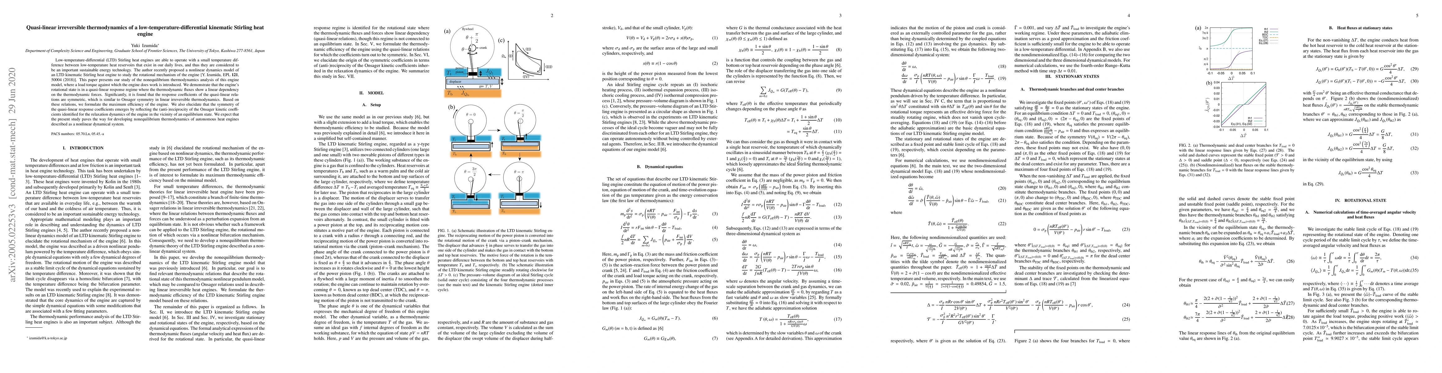 This paper analyzes the quasi-linear irreversible thermodynamics of a low-temperature-differential Stirling heat engine, demonstrating that its rotational state operates in a quasi-linear regime with symmetric response coefficients akin to Onsager symmetry. The study formulates the engine's maximum efficiency based on these quasi-linear relations.