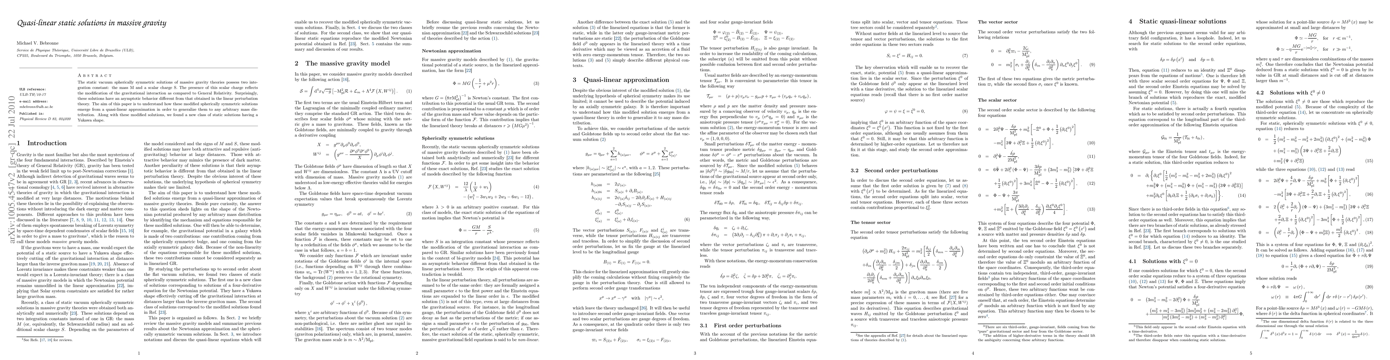 This paper explores the static vacuum spherically symmetric solutions of massive gravity, revealing the presence of a scalar charge S that modifies gravitational interactions. It investigates how quasi-linear approximations can generalize these solutions to arbitrary mass distributions, uncovering a new class of Yukawa-shaped static solutions.