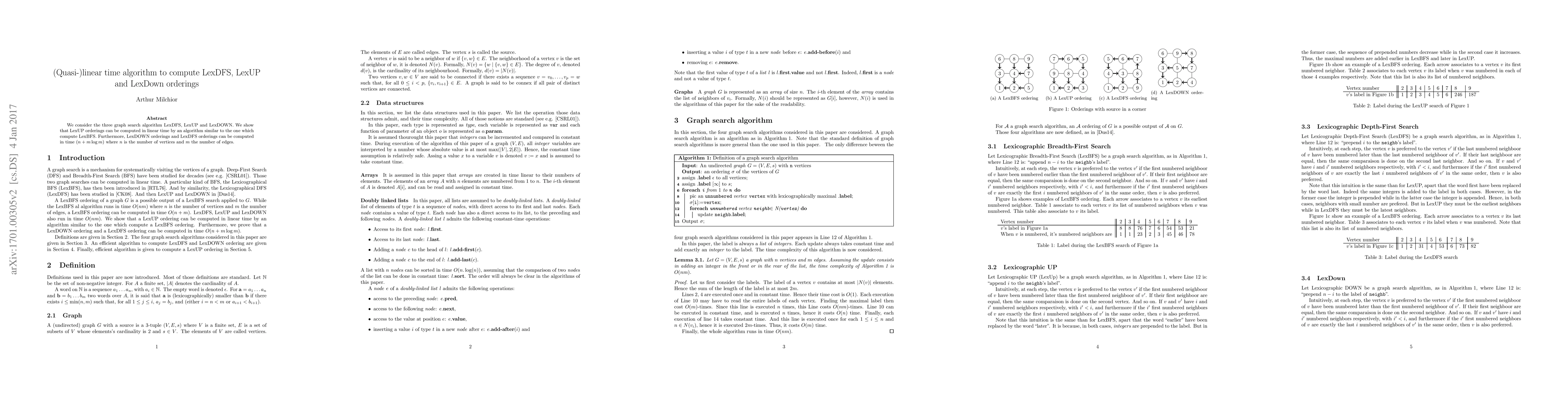 Summary: This paper presents efficient algorithms for computing LexDFS, LexUP, and LexDOWN orderings in linear time for LexUP and quasi-linear time for LexDFS and LexDOWN, using techniques similar to those used in LexBFS.