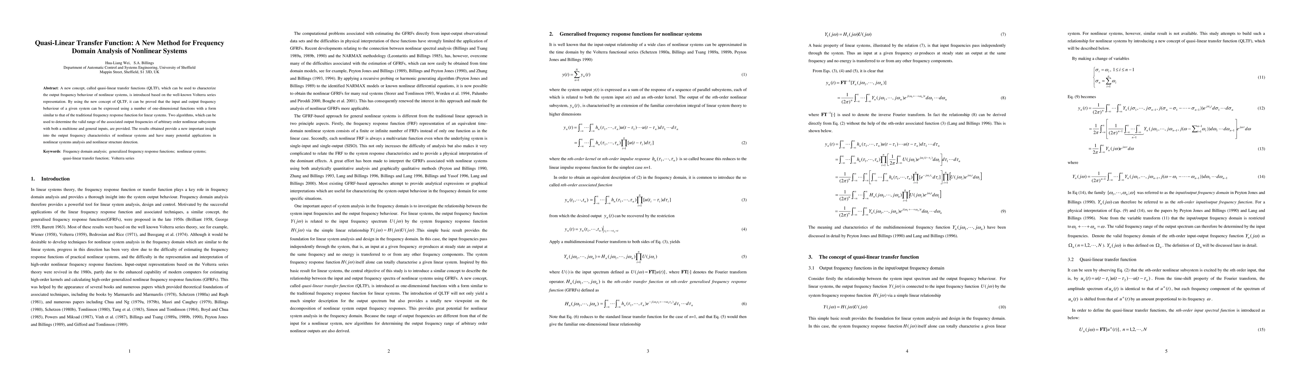 This paper introduces quasi-linear transfer functions (QLTF) to characterize the frequency domain behavior of nonlinear systems using Volterra series. It presents algorithms to determine the valid frequency range for nonlinear subsystems, offering new insights into their output frequency characteristics with potential applications in nonlinear systems analysis.
