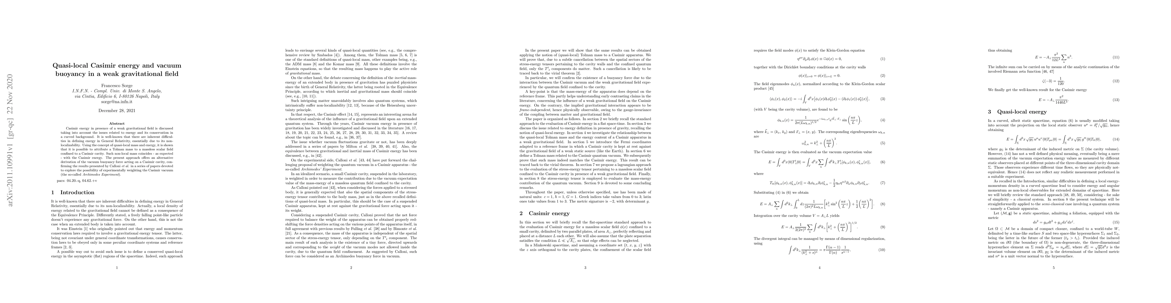 Casimir energy in presence of a weak gravitational field is discussed taking into account the issues related to energy and its conservation in a curved background. It is well-known that there are inherent difficulties in defining energy in General Relativity, essentially due to its non-localizability. Using the concept of quasi-local mass and energy, it is shown that it is possible to attribute a Tolman mass to a massless scalar field confined to a Casimir cavity. Such non-local mass coincides - as expected - with the Casimir energy. The present approach offers an alternative derivation of the vacuum buoyancy force acting on a Casimir cavity, confirming the results presented by Calloni {\em et al.} in a series of papers devoted to explore the possibility of experimentally weighting the Casimir vacuum (the so-called Archimedes Experiment).