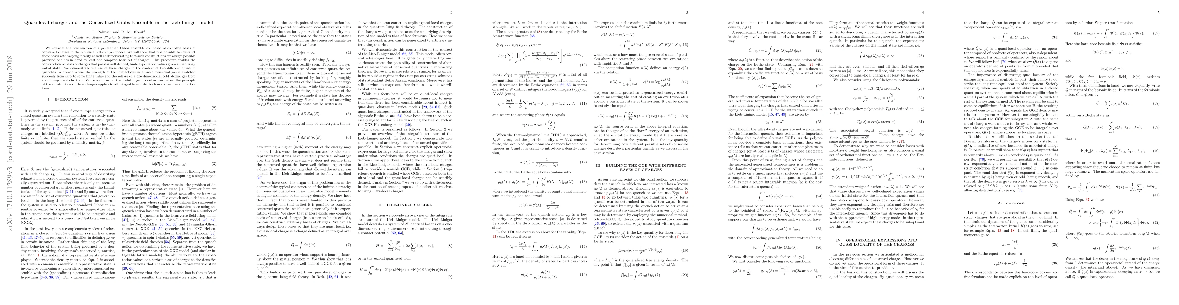 This paper constructs a generalized Gibbs ensemble for the Lieb-Liniger model using complete bases of conserved quasi-local charges, demonstrating the feasibility of such constructions with varying locality. The method allows for well-defined, finite expectation values for these charges, which are applied to analyze quantum quenches in one-dimensional systems.
