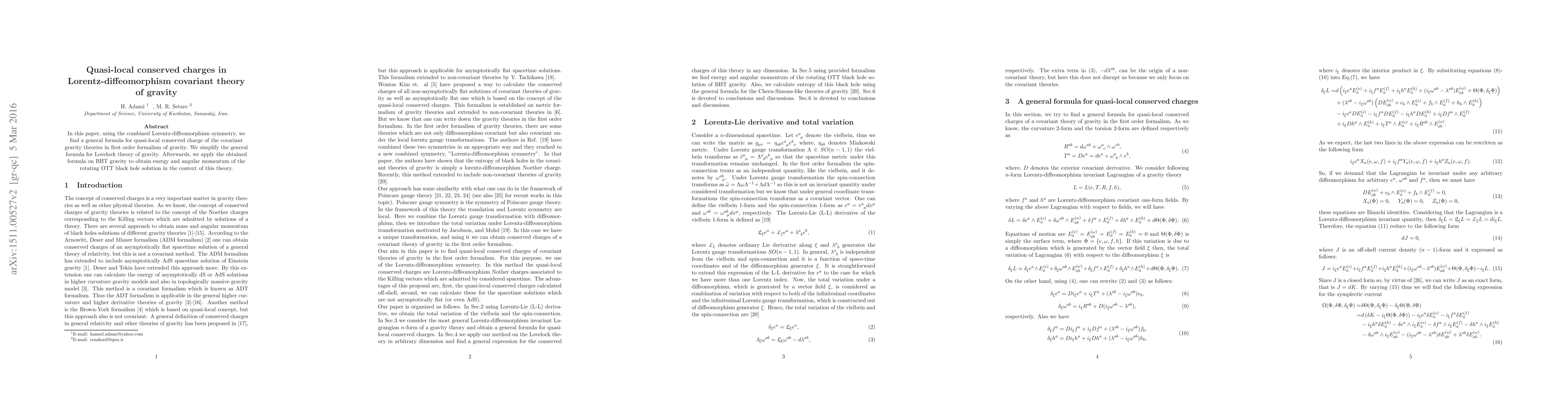 This paper derives a general formula for quasi-local conserved charges in covariant gravity theories using Lorentz-diffeomorphism symmetry, simplifies it for Lovelock gravity, and applies it to BHT gravity to compute energy and angular momentum for rotating OTT black holes.