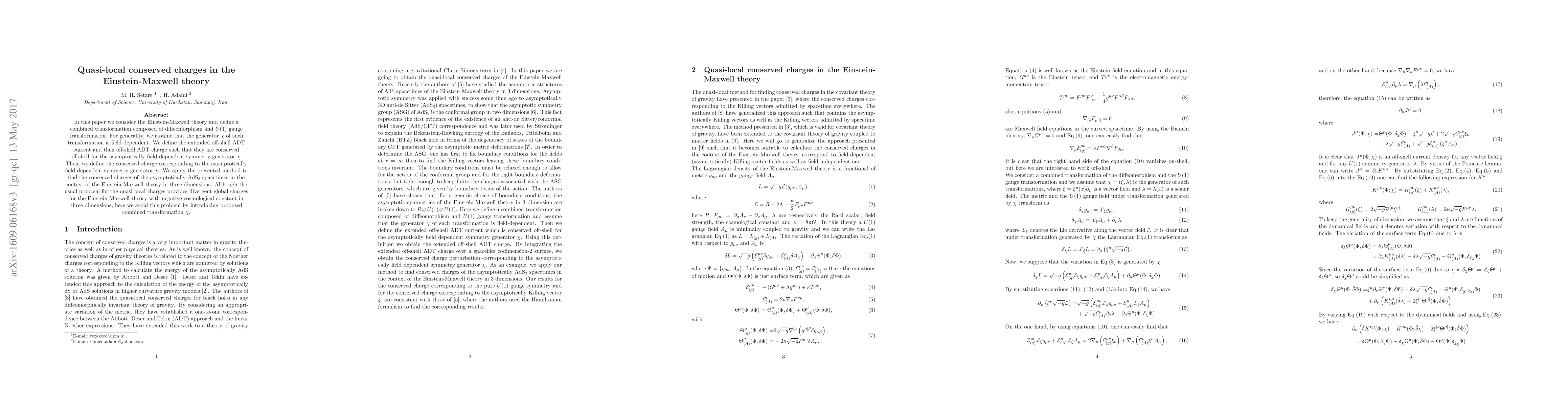 This paper defines quasi-local conserved charges in the Einstein-Maxwell theory using a combined diffeomorphism and $U(1)$ gauge transformation with a field-dependent generator $\chi$. It introduces an extended off-shell ADT current and charge, avoiding divergences in asymptotically AdS$_3$ spacetimes.