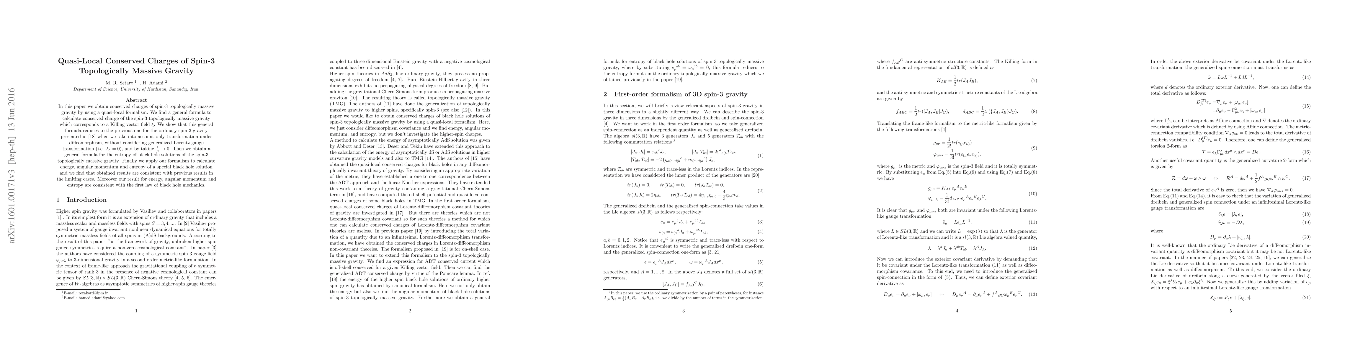 This paper derives quasi-local conserved charges for spin-3 topologically massive gravity using a general formula applicable to Killing vector fields. It also extends the formula to calculate black hole entropy and verifies consistency with previous results and the first law of black hole mechanics.