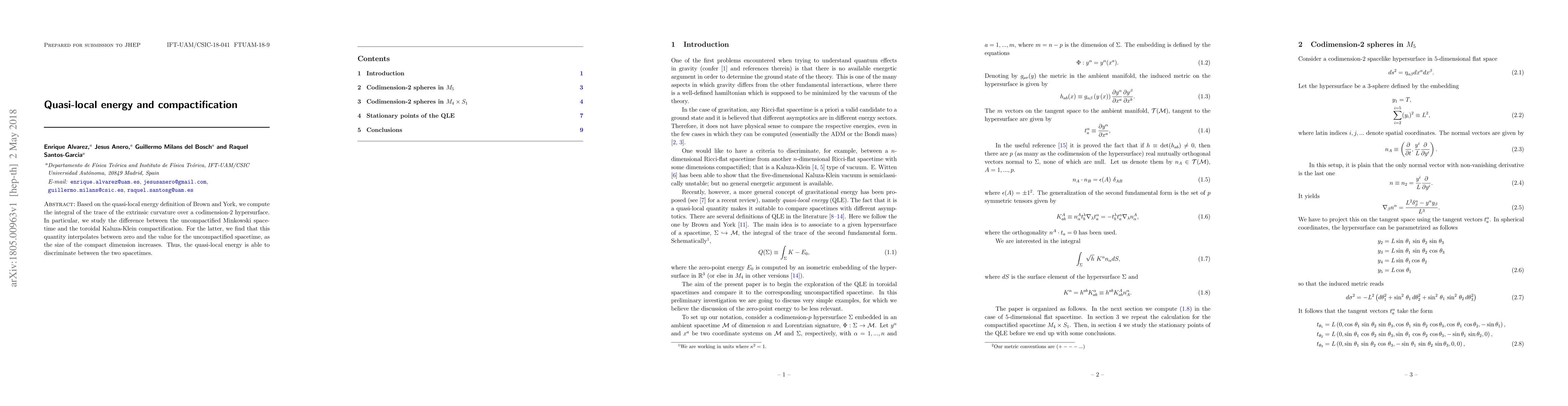 Based on the quasi-local energy definition of Brown and York, we compute the integral of the trace of the extrinsic curvature over a codimension-2 hypersurface. In particular, we study the difference between the uncompactified Minkowski spacetime and the toroidal Kaluza-Klein compactification. For the latter, we find that this quantity interpolates between zero and the value for the uncompactified spacetime, as the size of the compact dimension increases. Thus, the quasi-local energy is able to discriminate between the two spacetimes.