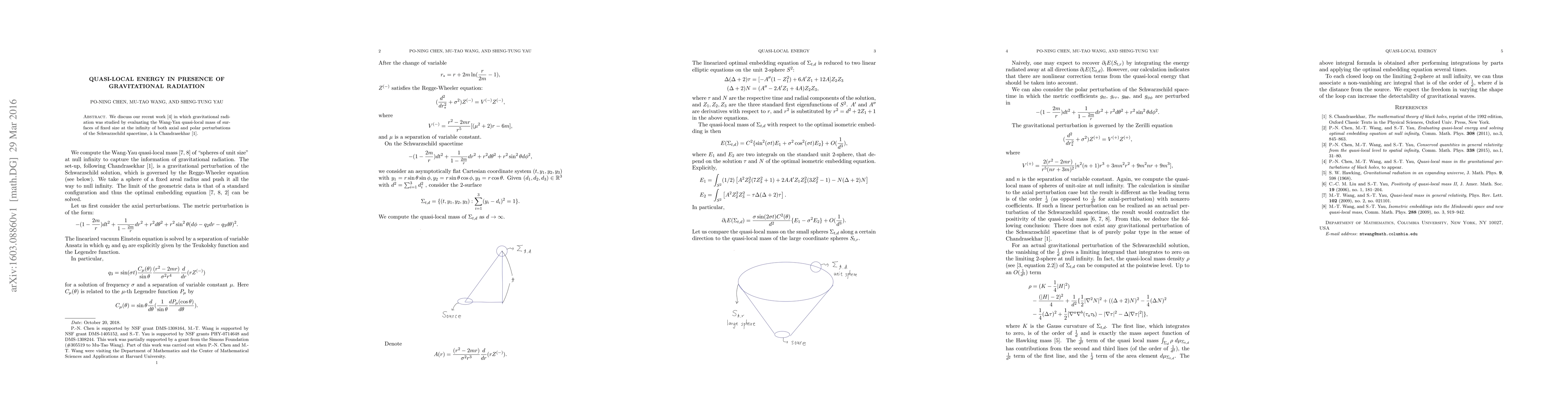 We discuss our recent work [4] in which gravitational radiation was studied by evaluating the Wang-Yau quasi-local mass of surfaces of fixed size at the infinity of both axial and polar perturbations of the Schwarzschild spacetime, \`{a} la Chandrasekhar [1].