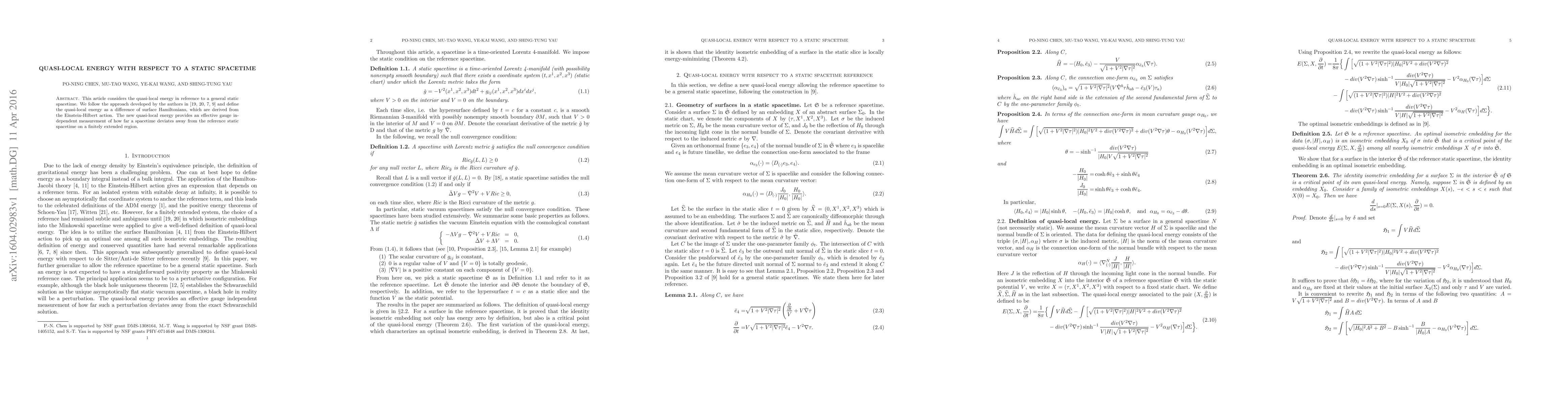 This paper defines quasi-local energy in static spacetimes using surface Hamiltonians derived from the Einstein-Hilbert action, offering a gauge-independent measure of spacetime deviation from a static reference within a finite region.