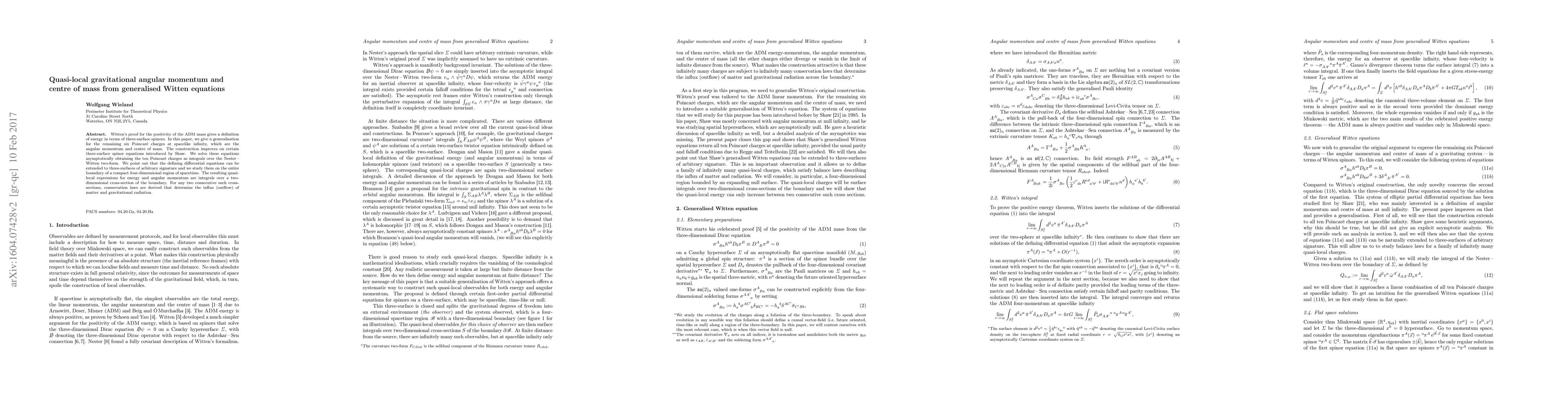 This paper generalises Witten's equations to define quasi-local gravitational angular momentum and centre of mass, improving on Shaw's three-surface spinor approach. The ten Poincar\'e charges are obtained asymptotically, with conservation laws derived for the influx and outflow of matter and radiation across boundary cross-sections.
