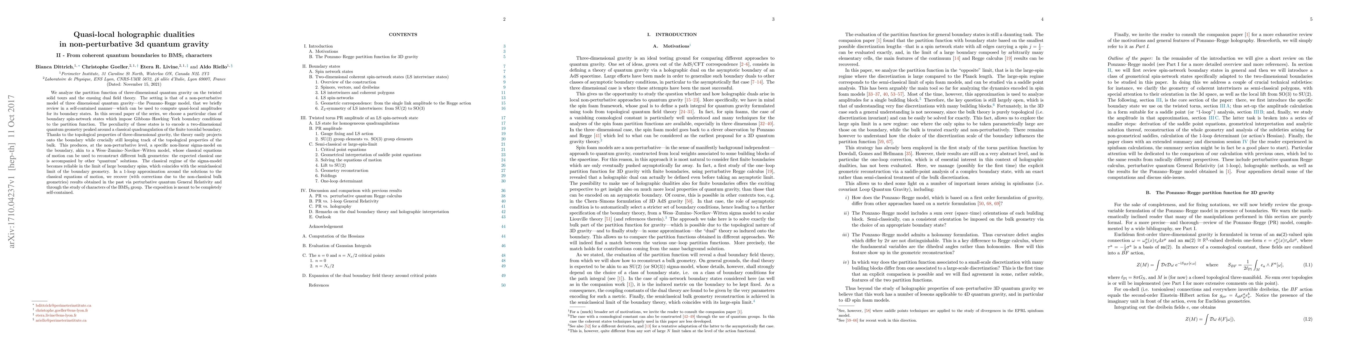 We analyze the partition function of three-dimensional quantum gravity on the twisted solid tours and the ensuing dual field theory. The setting is that of a non-perturbative model of three dimensional quantum gravity--the Ponzano-Regge model, that we briefly review in a self-contained manner--which can be used to compute quasi-local amplitudes for its boundary states. In this second paper of the series, we choose a particular class of boundary spin-network states which impose Gibbons-Hawking-York boundary conditions to the partition function. The peculiarity of these states is to encode a two-dimensional quantum geometry peaked around a classical quadrangulation of the finite toroidal boundary. Thanks to the topological properties of three-dimensional gravity, the theory easily projects onto the boundary while crucially still keeping track of the topological properties of the bulk. This produces, at the non-perturbative level, a specific non-linear sigma-model on the boundary, akin to a Wess-Zumino-Novikov-Witten model, whose classical equations of motion can be used to reconstruct different bulk geometries: the expected classical one is accompanied by other "quantum" solutions. The classical regime of the sigma-model becomes reliable in the limit of large boundary spins, which coincides with the semiclassical limit of the boundary geometry. In a 1-loop approximation around the solutions to the classical equations of motion, we recover (with corrections due to the non-classical bulk geometries) results obtained in the past via perturbative quantum General Relativity and through the study of characters of the BMS3 group. The exposition is meant to be completely self-contained.