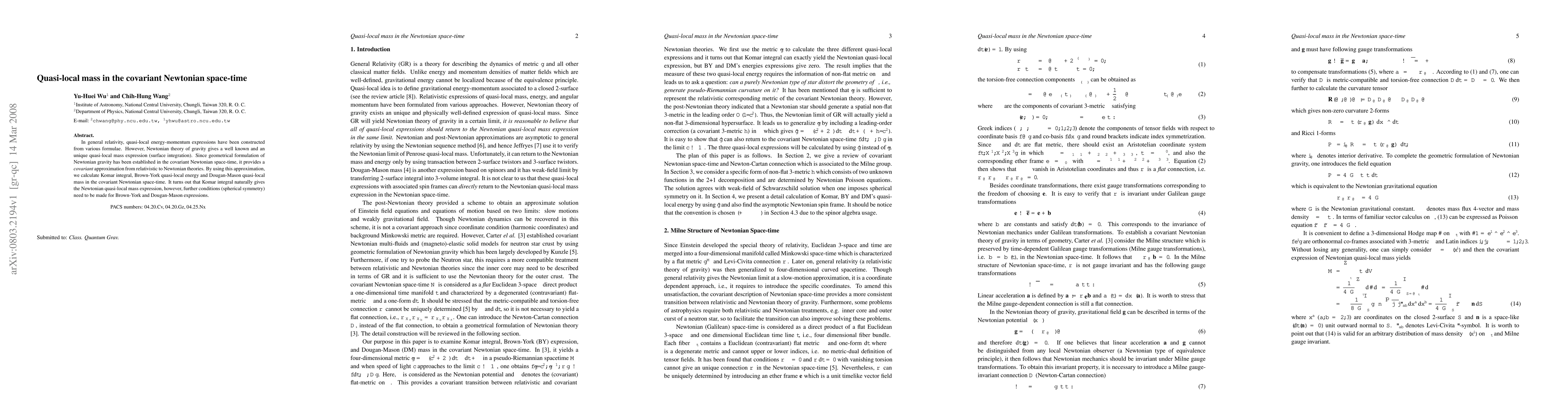 This paper explores quasi-local mass expressions in the covariant Newtonian space-time, showing that the Komar integral naturally yields the Newtonian quasi-local mass, while the Brown-York and Dougan-Mason expressions require additional spherical symmetry conditions.