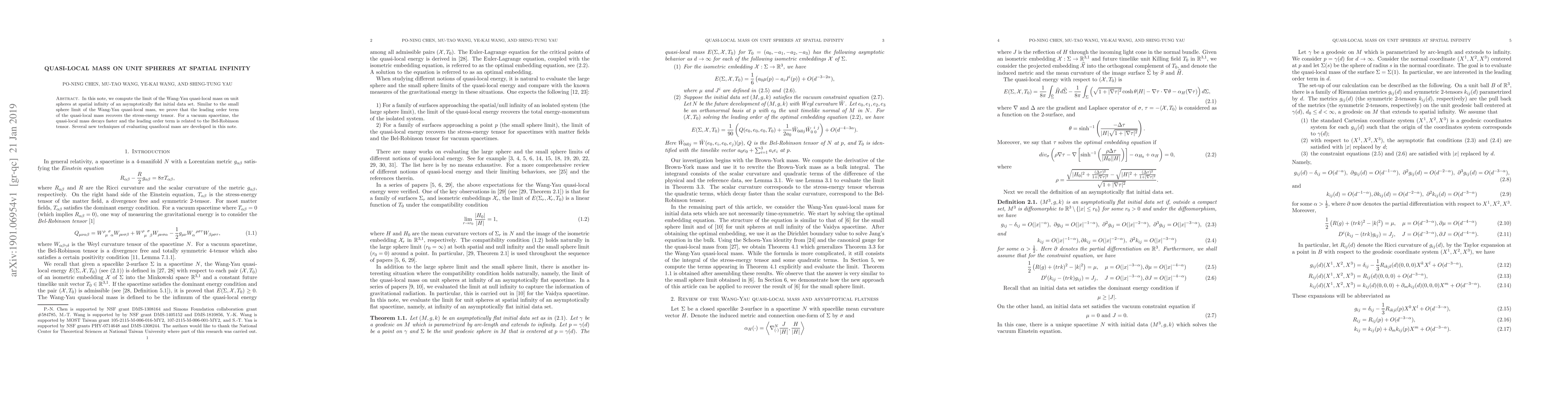 In this note, we compute the limit of the Wang-Yau quasi-local mass on unit spheres at spatial infinity of an asymptotically flat initial data set. Similar to the small sphere limit of the Wang-Yau quasi-local mass, we prove that the leading order term of the quasi-local mass recovers the stress-energy tensor. For a vacuum spacetime, the quasi-local mass decays faster and the leading order term is related to the Bel-Robinson tensor. Several new techniques of evaluating quasilocal mass are developed in this note.