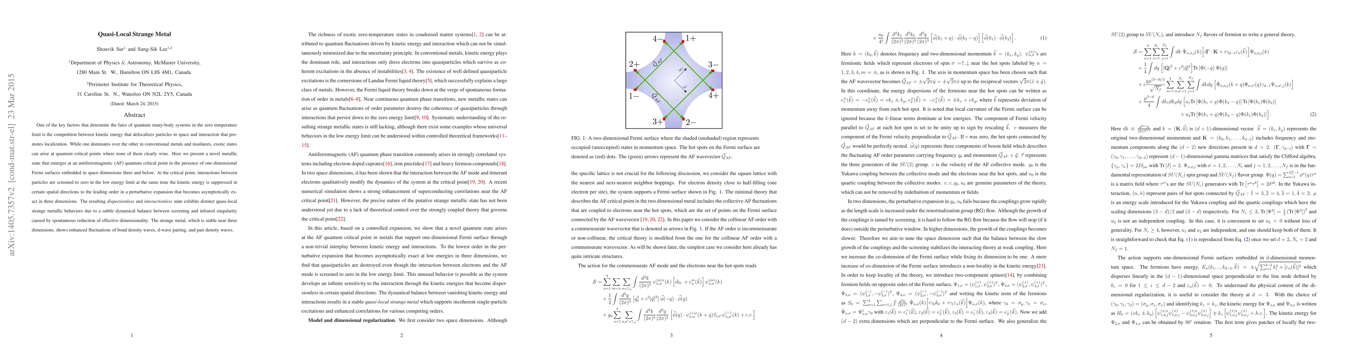 One of the key factors that determine the fates of quantum many-body systems in the zero temperature limit is the competition between kinetic energy that delocalizes particles in space and interaction that promotes localization. While one dominates over the other in conventional metals and insulators, exotic states can arise at quantum critical points where none of them clearly wins. Here we present a novel metallic state that is realized at the antiferromagnetic (AF) quantum critical point in space dimensions three and below. At the critical point, interactions between particles are screened to zero in the low energy limit at the same time the kinetic energy is suppressed in certain spatial directions to the leading order in a perturbative expansion that becomes asymptotically exact in three dimensions. The resulting dispersionless and interactionless state exhibits distinct quasi-local strange metallic behaviors due to the subtle dynamical balance between screening and infrared singularity caused by the spontaneous reduction of effective dimensionality.