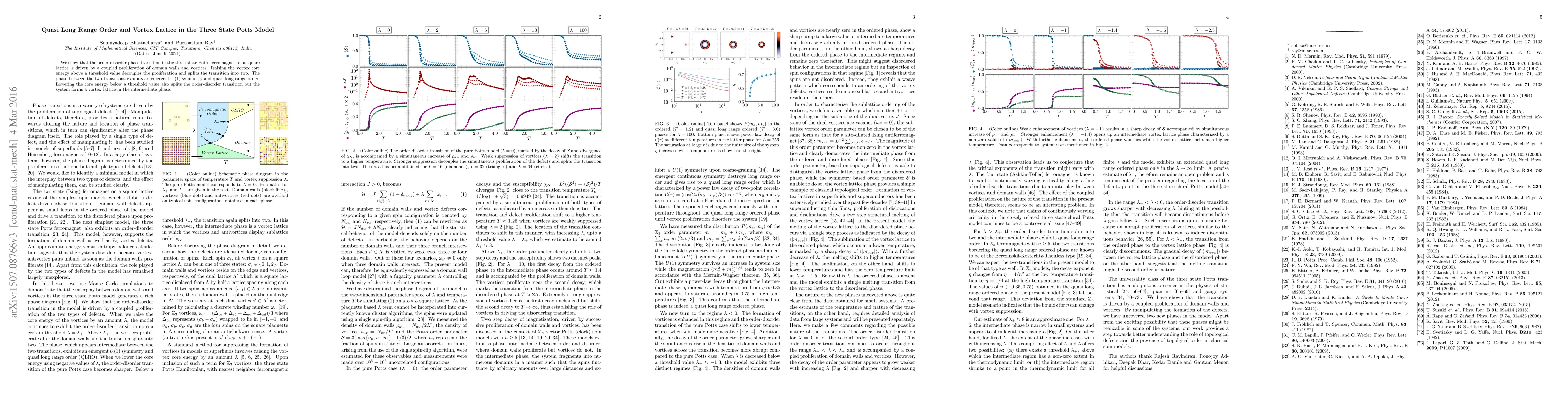 We show that the order-disorder phase transition in the three state Potts ferromagnet on a square lattice is driven by a coupled proliferation of vortices and domain walls. Raising the vortex core energy above a certain value decouples the proliferation and splits the transition into two. The phase between the two transitions exhibits an emergent U(1) symmetry and quasi long range order. Lowering the core energy also splits the order-disorder transition but the proliferation does not decouple and a vortex lattice appears as the intermediate phase.