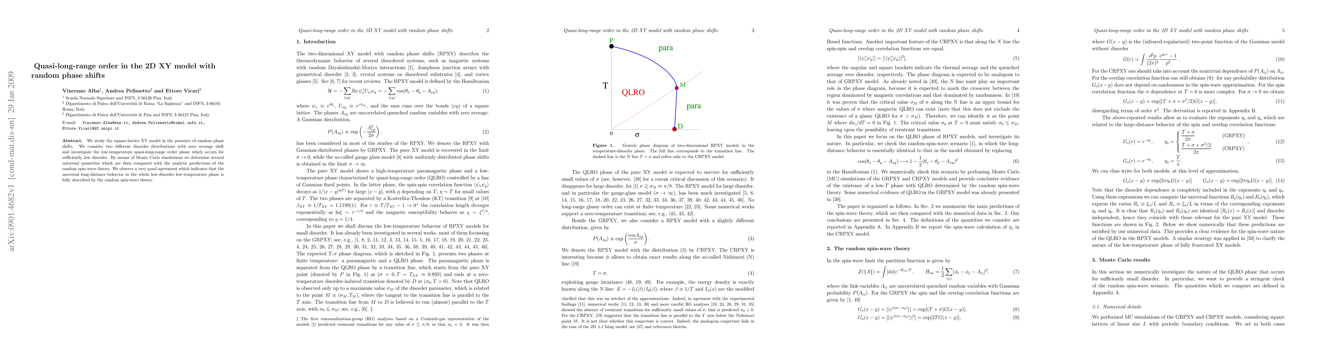 This study investigates the quasi-long-range order in the 2D XY model under random phase shifts on a square lattice. Using Monte Carlo simulations, it finds a low-temperature phase with good agreement between simulation results and predictions from random spin-wave theory, indicating its effectiveness in describing the long-distance behavior.