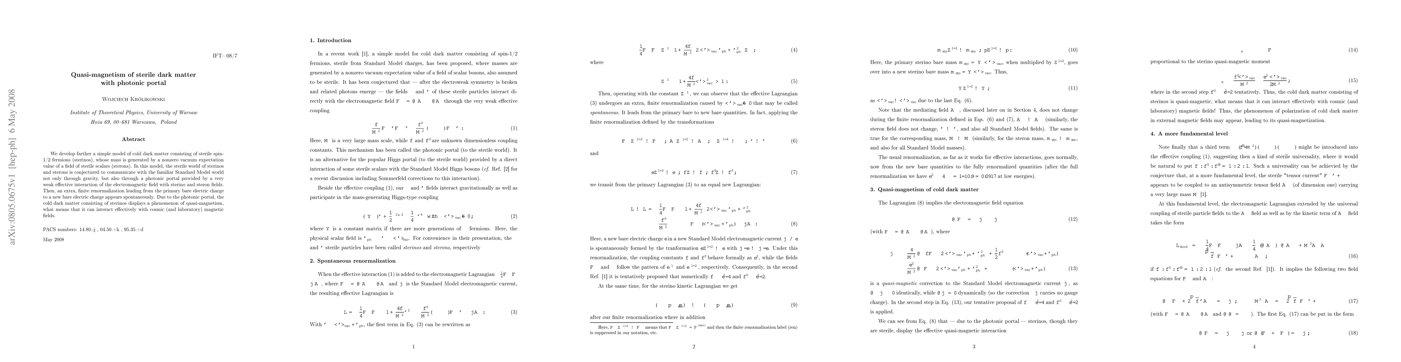 We develop farther a simple model of cold dark matter consisting of sterile spin-1/2 fermions (sterinos), whose mass is generated by a nonzero vacuum expectation value of a field of sterile scalars (sterons). In this model, the sterile world of sterinos and sterons is conjectured to communicate with the familiar Standard Model world not only through gravity, but also through a photonic portal provided by a very weak effective interaction of the electromagnetic field with sterino and steron fields. Then, an extra, finite renormalization leading from the primary bare electric charge to a new bare electric charge appears spontaneously. Due to the photonic portal, the cold dark matter consisting of sterinos displays a phenomenon of quasi-magnetism, what means that it can interact effectively with cosmic (and laboratory) magnetic fields.