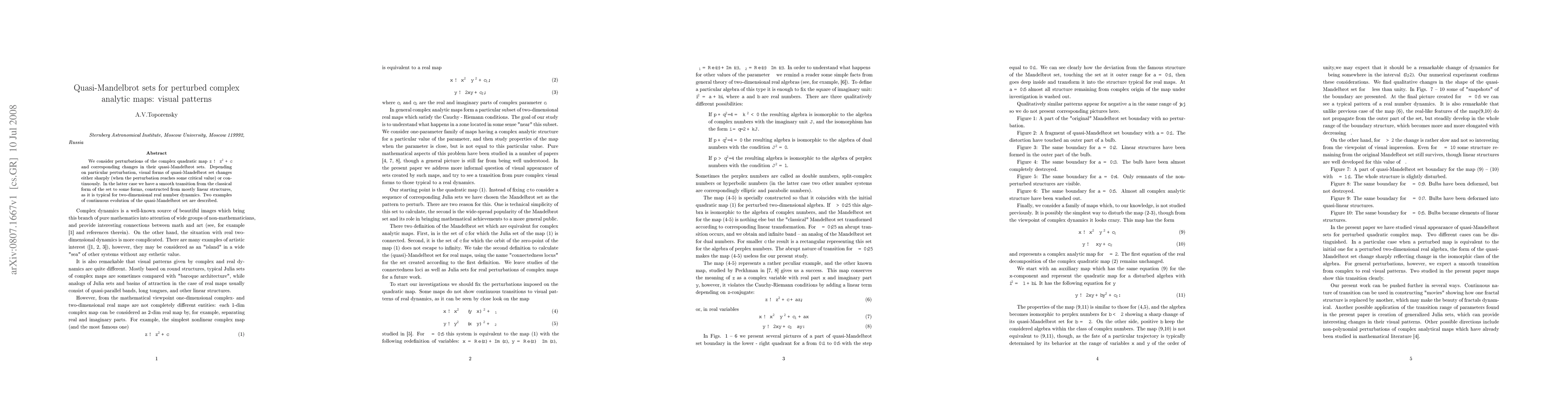 This paper investigates how perturbations of the complex quadratic map $z \to z^2 + c$ affect the quasi-Mandelbrot sets, revealing sharp or continuous changes in their visual patterns. It describes smooth transitions from classical forms to linear structures typical of two-dimensional real number dynamics.
