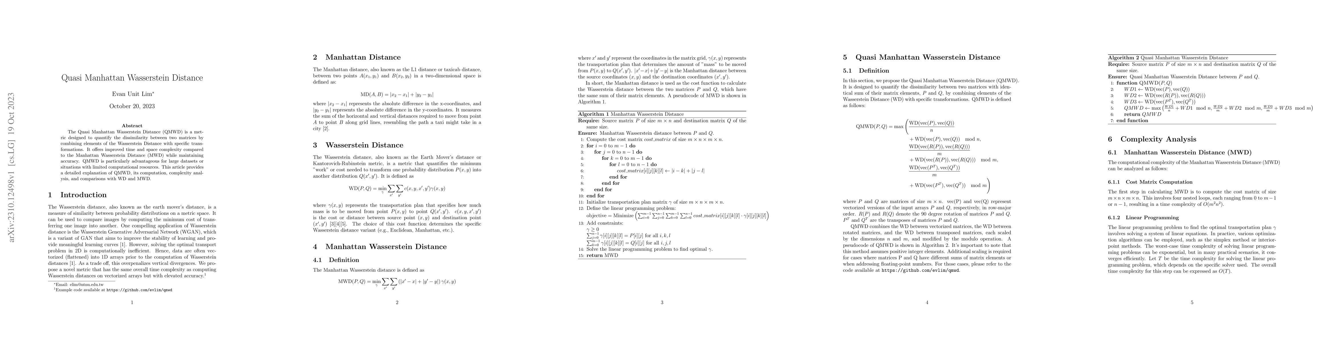 The Quasi Manhattan Wasserstein Distance (QMWD) is a metric designed to quantify the dissimilarity between two matrices by combining elements of the Wasserstein Distance with specific transformations. It offers improved time and space complexity compared to the Manhattan Wasserstein Distance (MWD) while maintaining accuracy. QMWD is particularly advantageous for large datasets or situations with limited computational resources. This article provides a detailed explanation of QMWD, its computation, complexity analysis, and comparisons with WD and MWD.