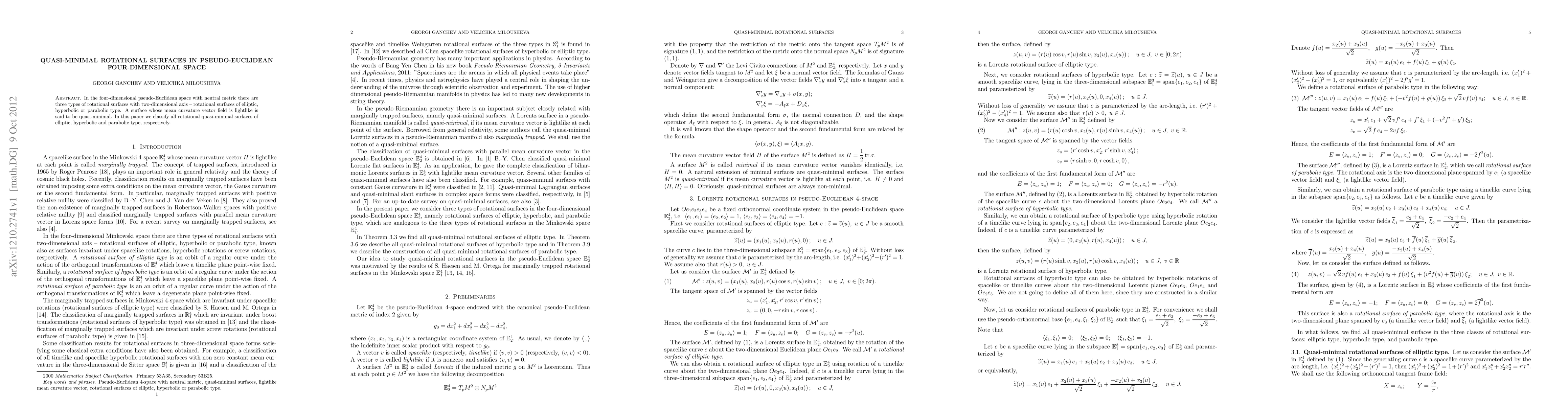 This paper classifies quasi-minimal rotational surfaces in four-dimensional pseudo-Euclidean space, categorizing them as elliptic, hyperbolic, or parabolic types based on their mean curvature vector fields.