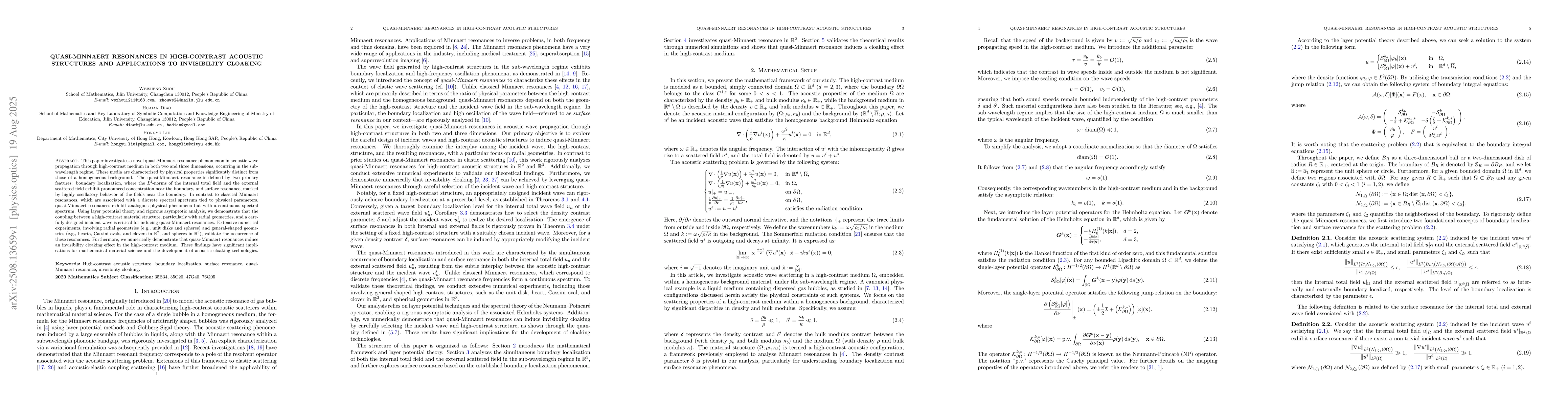 This research paper introduces quasi-Minnaert resonances in high-contrast acoustic structures, localized near boundaries and exhibiting continuous spectra. Numerical experiments validate these resonances in various geometries, demonstrating potential for acoustic cloaking technologies.
