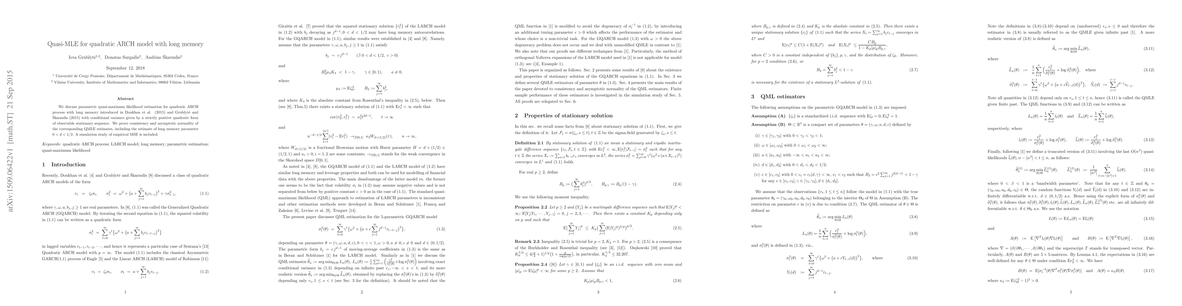 We discuss parametric quasi-maximum likelihood estimation for quadratic ARCH process with long memory introduced in Doukhan et al. (2015) and Grublyt\.e and \v{S}karnulis (2015) with conditional variance given by a strictly positive quadratic form of observable stationary sequence. We prove consistency and asymptotic normality of the corresponding QMLE estimates, including the estimate of long memory parameter $0< d < 1/2$. A simulation study of empirical MSE is included.