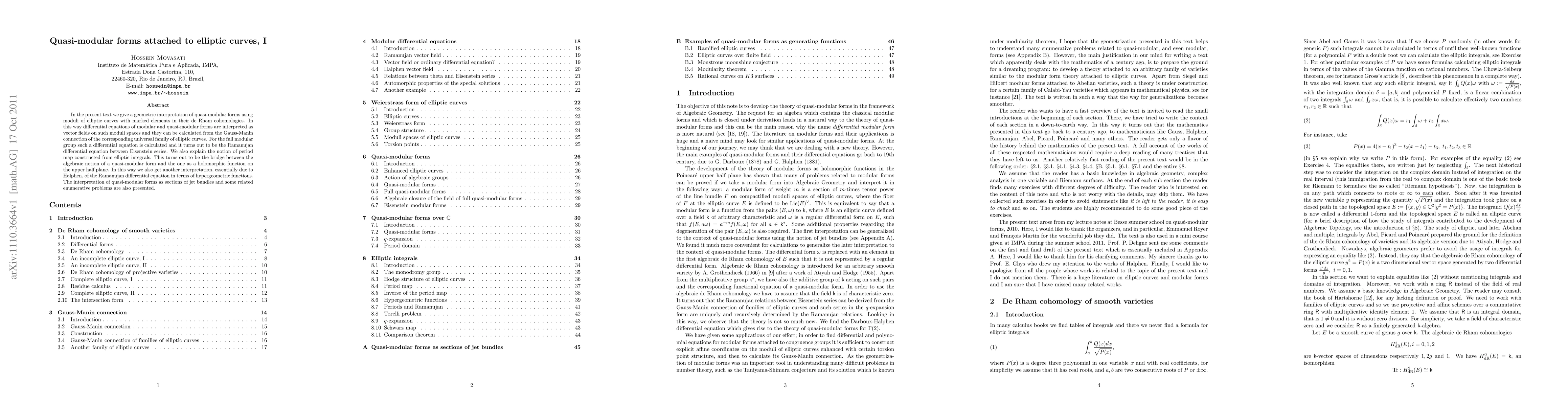In the present text we give a geometric interpretation of quasi-modular forms using moduli of elliptic curves with marked elements in their de Rham cohomologies. In this way differential equations of modular and quasi-modular forms are interpreted as vector fields on such moduli spaces and they can be calculated from the Gauss-Manin connection of the corresponding universal family of elliptic curves. For the full modular group such a differential equation is calculated and it turns out to be the Ramanujan differential equation between Eisenstein series. We also explain the notion of period map constructed from elliptic integrals. This turns out to be the bridge between the algebraic notion of a quasi-modular form and the one as a holomorphic function on the upper half plane. In this way we also get another interpretation, essentially due to Halphen, of the Ramanujan differential equation in terms of hypergeometric functions. The interpretation of quasi-modular forms as sections of jet bundles and some related enumerative problems are also presented.