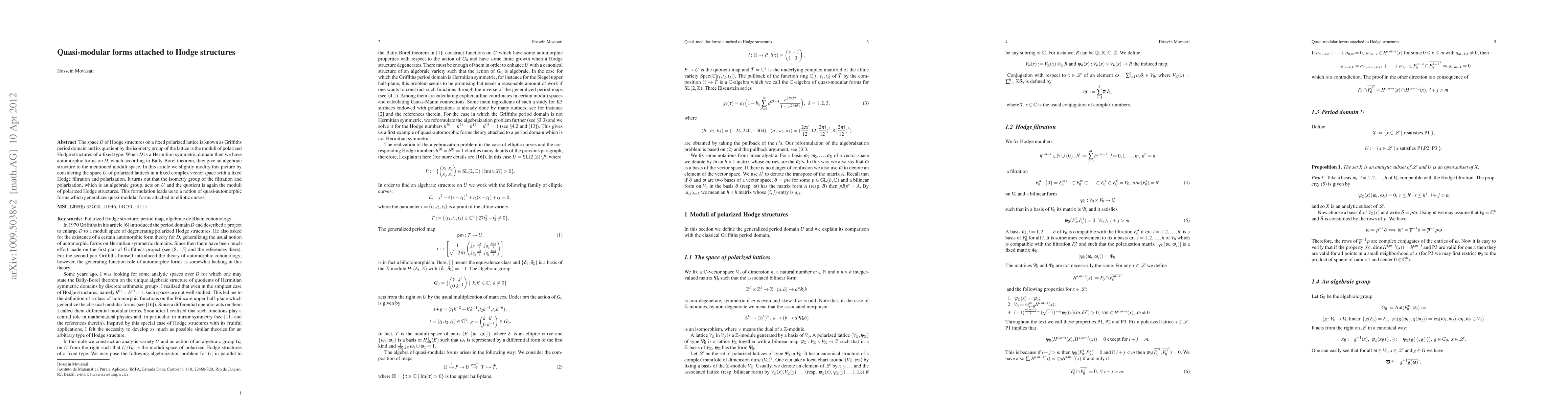This paper explores the algebraic structure of moduli spaces of polarized Hodge structures via quasi-automorphic forms, generalizing quasi-modular forms. It introduces the space $U$ of polarized lattices with fixed Hodge filtration and polarization, showing that the isometry group of this structure acts on $U$ to yield the moduli space.