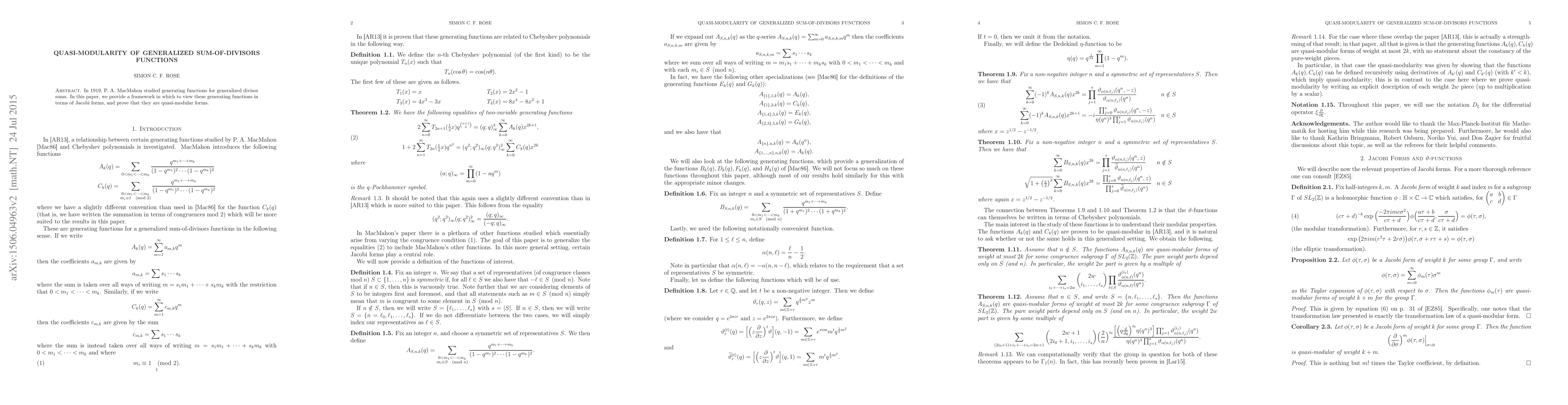 This paper establishes a connection between generating functions for generalized divisor sums and Jacobi forms, proving they are quasi-modular forms, which has implications for understanding these mathematical constructs.