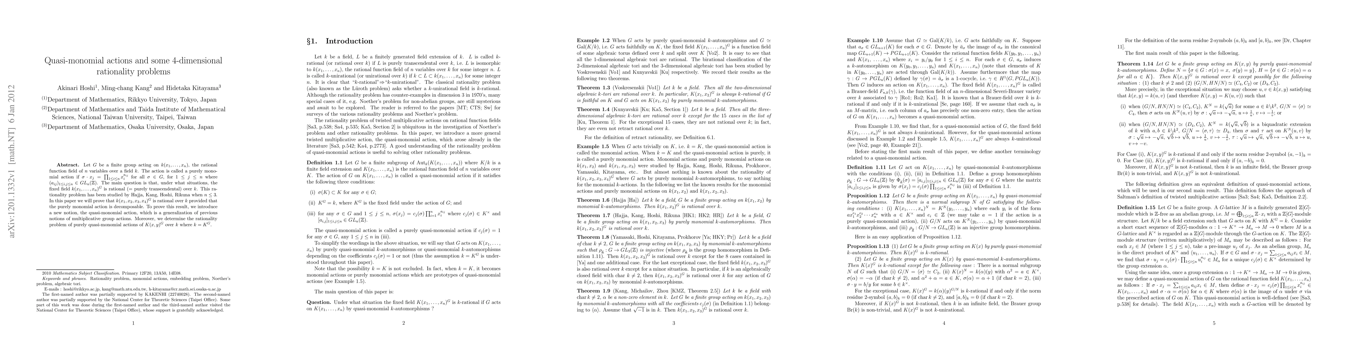 This paper investigates the rationality of the fixed field $k(x_1,...,x_4)^G$ under purely monomial actions, proving it is rational when the action is decomposable. It introduces quasi-monomial actions as a generalization and also addresses the rationality problem for $K(x,y)^G$ where $k = K^G$.