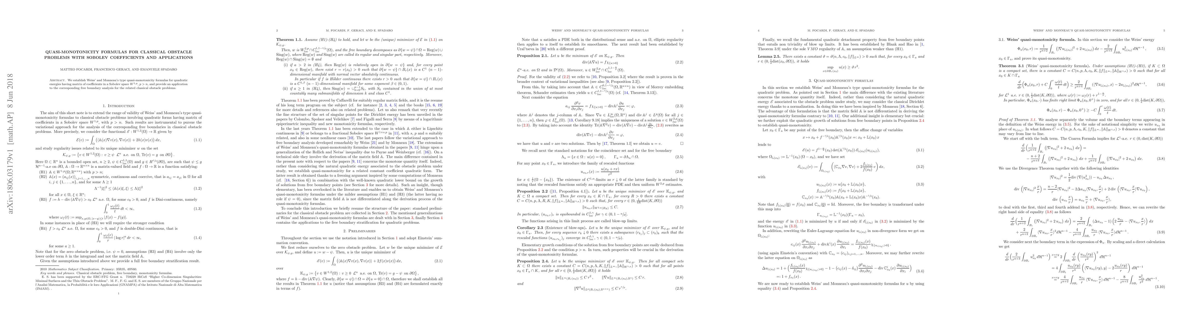 Summary: This paper establishes quasi-monotonicity formulas for quadratic energies with Sobolev coefficients in $W^{1,p}$ space, and applies these results to analyze free boundaries in classical obstacle problems.