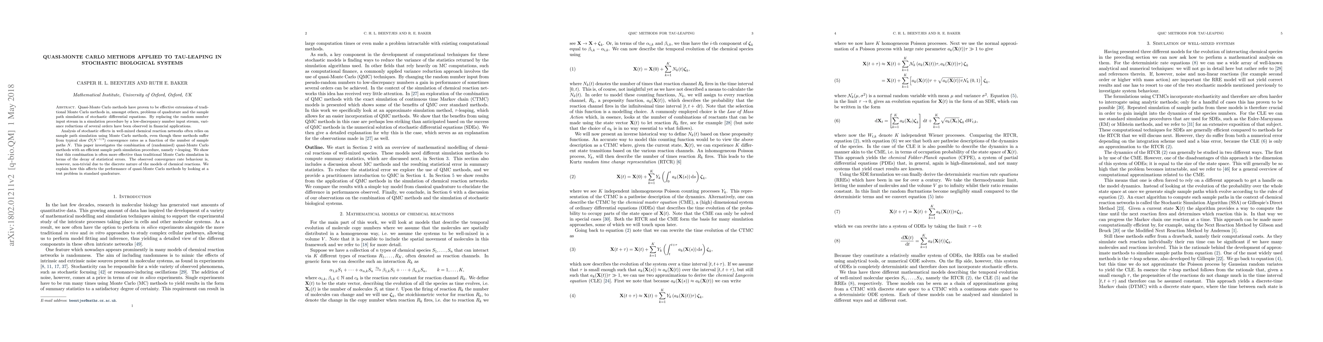 This paper explores the application of quasi-Monte Carlo methods to enhance $\tau$-leaping simulations in stochastic biological systems, demonstrating improved variance reduction and faster convergence rates compared to traditional Monte Carlo methods. The study highlights the nuanced impact of the discrete nature of chemical reaction models on the performance of quasi-Monte Carlo techniques.