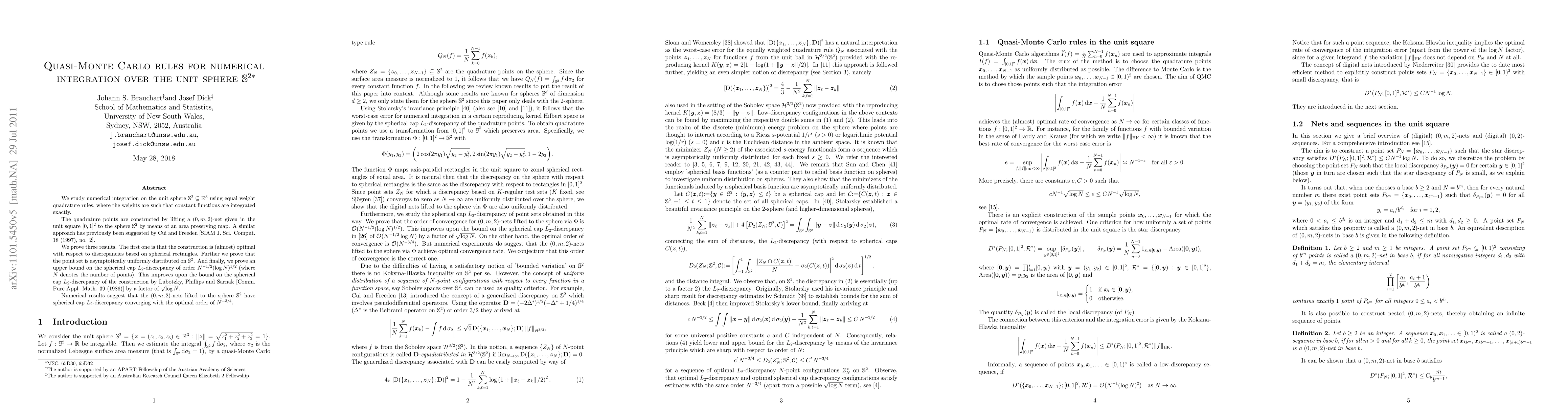 This paper presents a method for numerical integration on the unit sphere S^2 using equal weight quadrature rules. It proves the optimality of the construction based on spherical rectangles and demonstrates that the point set is asymptotically uniformly distributed on S^2. The paper also improves upon existing bounds of spherical cap L2-discrepancy, suggesting numerical results indicating optimal convergence rate of N^(-3/4).