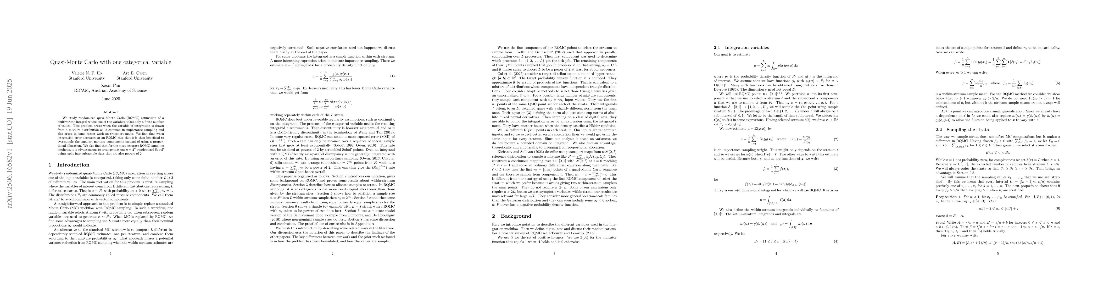 We study randomized quasi-Monte Carlo (RQMC) estimation of a multivariate integral where one of the variables takes only a finite number of values. This problem arises when the variable of integration is drawn from a mixture distribution as is common in importance sampling and also arises in some recent work on transport maps. We find that when integration error decreases at an RQMC rate that it is then beneficial to oversample the smallest mixture components instead of using a proportional allocation. We also find that for the most accurate RQMC sampling methods, it is advantageous to arrange that our $n=2^m$ randomized Sobol' points split into subsample sizes that are also powers of~$2$.