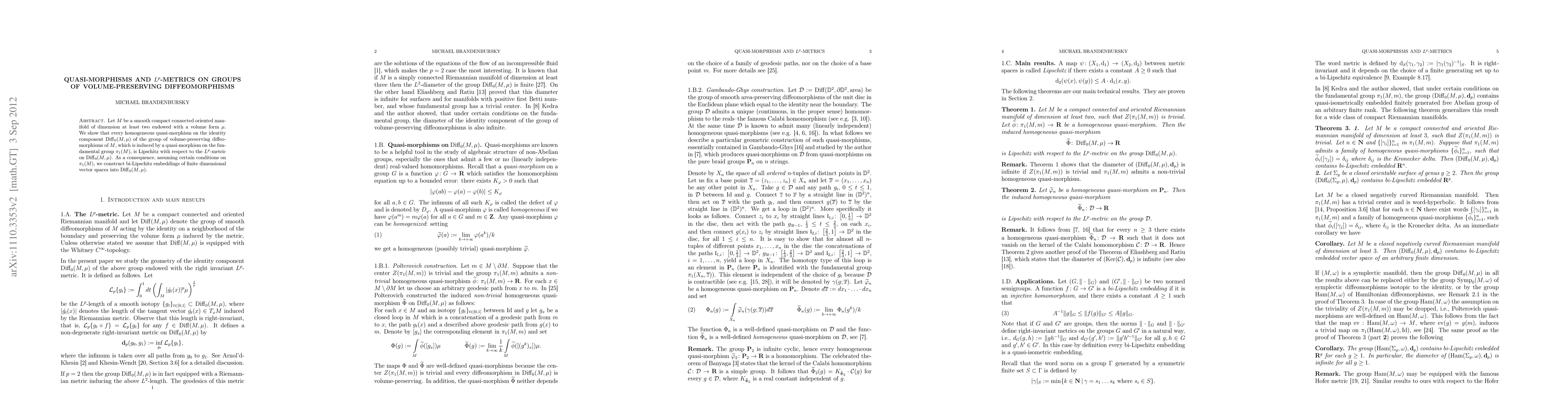 Researchers show that homogeneous quasi-morphisms on volume-preserving diffeomorphisms of a manifold are Lipschitz with respect to the L^p-metric, enabling bi-Lipschitz embeddings into this group.