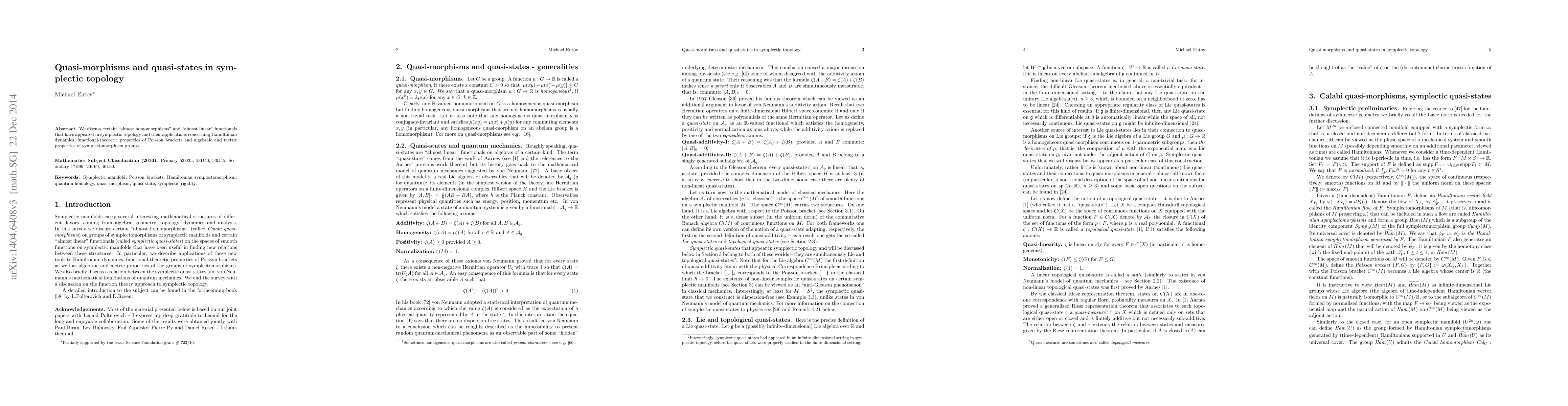 Summary: This paper surveys quasi-morphisms and quasi-states in symplectic topology, focusing on their roles in Hamiltonian dynamics and their implications for the functional and algebraic properties of symplectomorphism groups.
