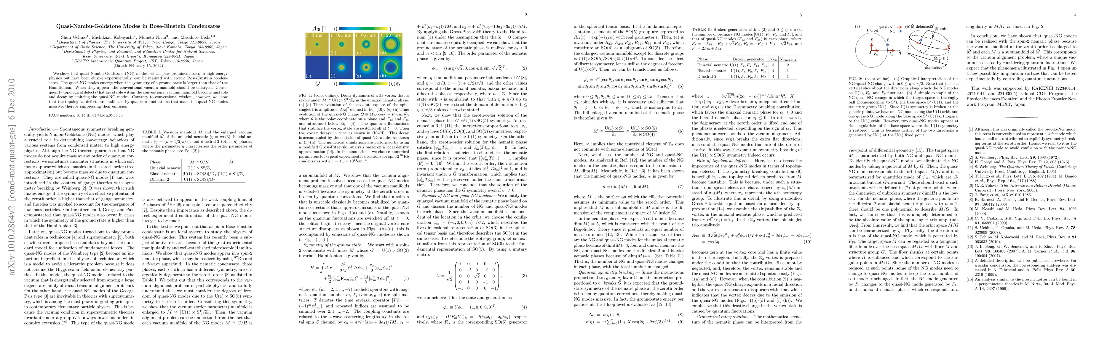 This research demonstrates the realization of quasi-Nambu-Goldstone modes in atomic Bose-Einstein condensates, showing that topological defects stabilize due to quantum fluctuations, which make these modes massive and inhibit their emission. This challenges conventional assumptions regarding the behavior of such modes.