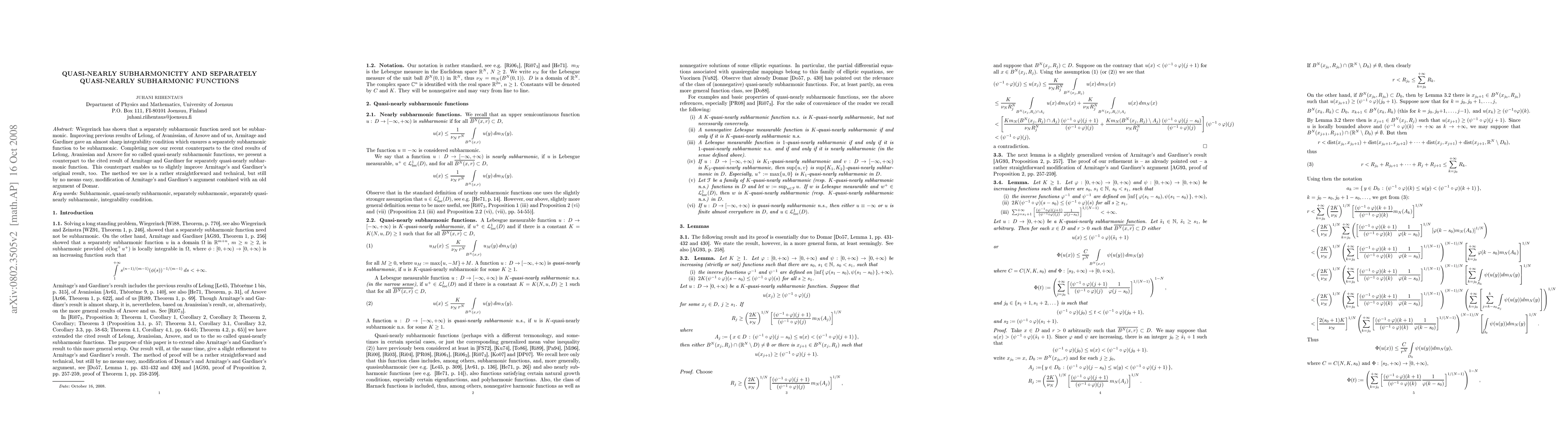 This paper improves upon previous results concerning subharmonic functions by presenting a new integrability condition that ensures a separately quasi-nearly subharmonic function is subharmonic. The method combines a technical modification of Armitage and Gardiner's argument with an old approach by Domar.