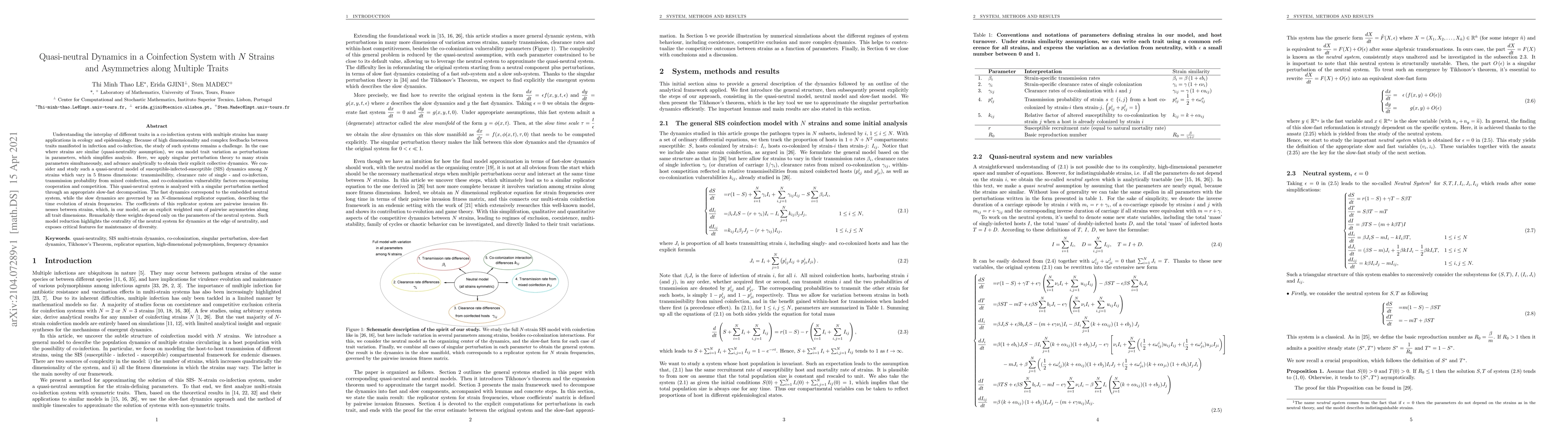 Understanding the interplay of different traits in a co-infection system with multiple strains has many applications in ecology and epidemiology. Because of high dimensionality and complex feedbacks between traits manifested in infection and co-infection, the study of such systems remains a challenge. In the case where strains are similar (quasi-neutrality assumption), we can model trait variation as perturbations in parameters, which simplifies analysis. Here, we apply singular perturbation theory to many strain parameters simultaneously, and advance analytically to obtain their explicit collective dynamics. We consider and study such a quasi-neutral model of susceptible-infected-susceptible (SIS) dynamics among N strains which vary in 5 fitness dimensions: transmissibility, clearance rate of single-and co-infection, transmission probability from mixed coinfection, and co-colonization vulnerability factors encompassing cooperation and competition. This quasi-neutral system is analyzed with a singular perturbation method through an appropriate slow-fast decomposition. The fast dynamics correspond to the embedded neutral system, while the slow dynamics are governed by an N-dimensional replicator equation, describing the time evolution of strain frequencies. The coefficients of this replicator system are pairwise invasion fitnesses between strains, which, in our model, are an explicit weighted sum of pairwise asymmetries along all trait dimensions. Remarkably these weights depend only on the parameters of the neutral system. Such model reduction highlights the centrality of the neutral system for dynamics at the edge of neutrality, and exposes critical features for maintenance of diversity.