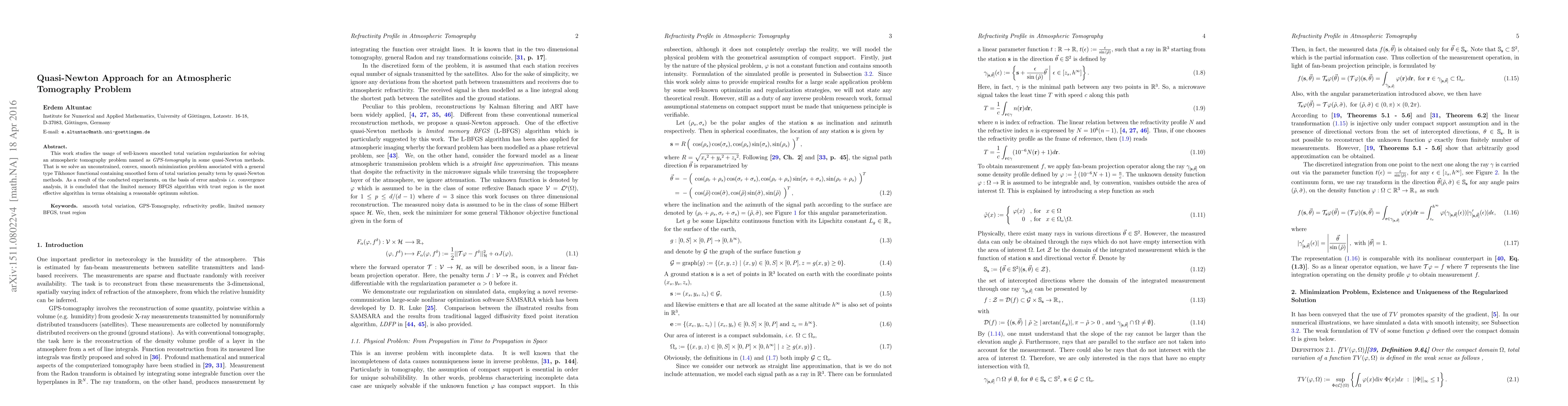 This research applies quasi-Newton methods, specifically the limited memory BFGS algorithm with trust region, to solve the GPS-tomography problem in atmospheric tomography. The method utilizes smoothed total variation regularization, demonstrating its effectiveness in obtaining a reasonably optimum solution.