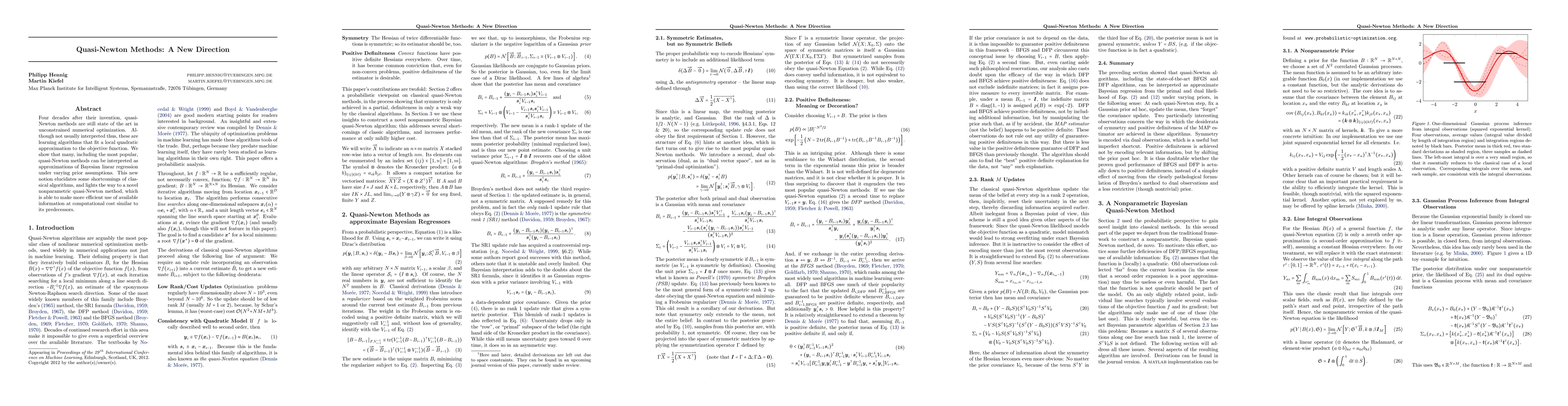 Four decades after their invention, quasi-Newton methods are still state of the art in unconstrained numerical optimization. Although not usually interpreted thus, these are learning algorithms that fit a local quadratic approximation to the objective function. We show that many, including the most popular, quasi-Newton methods can be interpreted as approximations of Bayesian linear regression under varying prior assumptions. This new notion elucidates some shortcomings of classical algorithms, and lights the way to a novel nonparametric quasi-Newton method, which is able to make more efficient use of available information at computational cost similar to its predecessors.