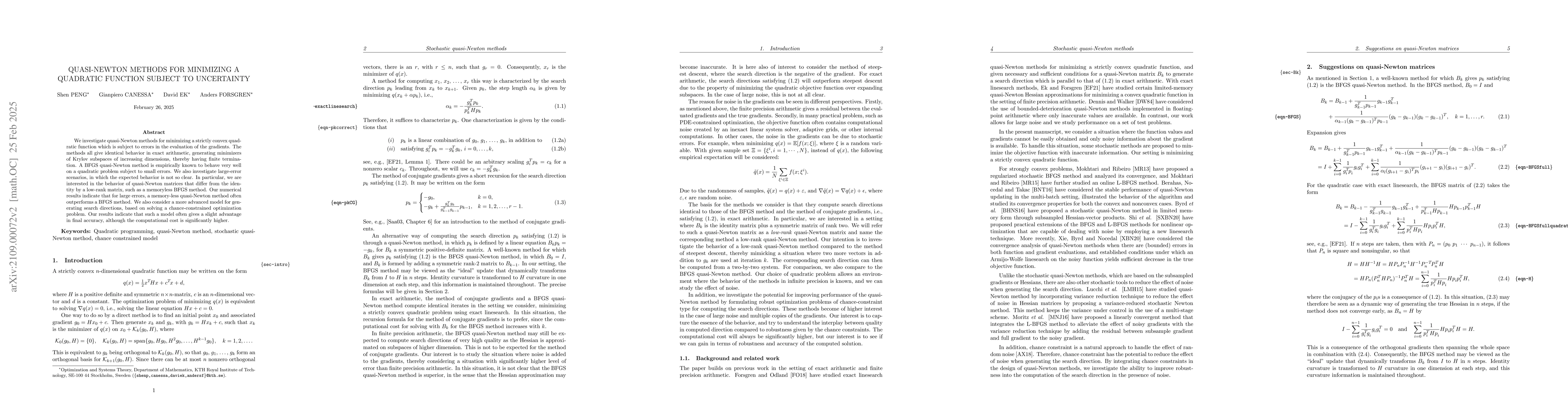 We investigate quasi-Newton methods for minimizing a strictly convex quadratic function which is subject to errors in the evaluation of the gradients. The methods all give identical behavior in exact arithmetic, generating minimizers of Krylov subspaces of increasing dimensions, thereby having finite termination. A BFGS quasi-Newton method is empirically known to behave very well on a quadratic problem subject to small errors. We also investigate large-error scenarios, in which the expected behavior is not so clear. In particular, we are interested in the behavior of quasi-Newton matrices that differ from the identity by a low-rank matrix, such as a memoryless BFGS method. Our numerical results indicate that for large errors, a memory-less quasi-Newton method often outperforms a BFGS method. We also consider a more advanced model for generating search directions, based on solving a chance-constrained optimization problem. Our results indicate that such a model often gives a slight advantage in final accuracy, although the computational cost is significantly higher.