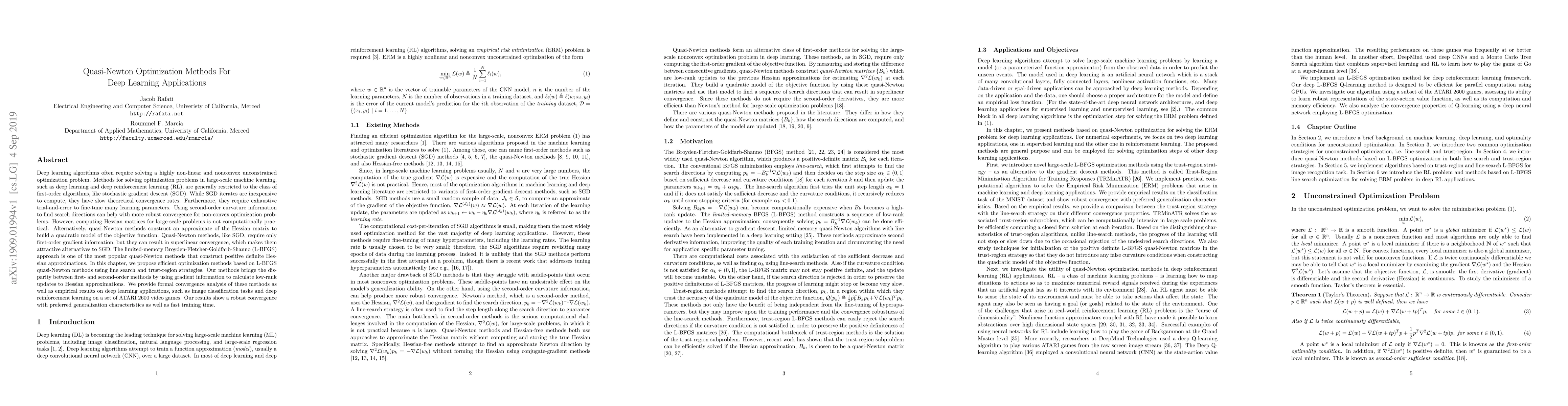 Deep learning algorithms often require solving a highly non-linear and nonconvex unconstrained optimization problem. Methods for solving optimization problems in large-scale machine learning, such as deep learning and deep reinforcement learning (RL), are generally restricted to the class of first-order algorithms, like stochastic gradient descent (SGD). While SGD iterates are inexpensive to compute, they have slow theoretical convergence rates. Furthermore, they require exhaustive trial-and-error to fine-tune many learning parameters. Using second-order curvature information to find search directions can help with more robust convergence for non-convex optimization problems. However, computing Hessian matrices for large-scale problems is not computationally practical. Alternatively, quasi-Newton methods construct an approximate of the Hessian matrix to build a quadratic model of the objective function. Quasi-Newton methods, like SGD, require only first-order gradient information, but they can result in superlinear convergence, which makes them attractive alternatives to SGD. The limited-memory Broyden-Fletcher-Goldfarb-Shanno (L-BFGS) approach is one of the most popular quasi-Newton methods that construct positive definite Hessian approximations. In this chapter, we propose efficient optimization methods based on L-BFGS quasi-Newton methods using line search and trust-region strategies. Our methods bridge the disparity between first- and second-order methods by using gradient information to calculate low-rank updates to Hessian approximations. We provide formal convergence analysis of these methods as well as empirical results on deep learning applications, such as image classification tasks and deep reinforcement learning on a set of ATARI 2600 video games. Our results show a robust convergence with preferred generalization characteristics as well as fast training time.