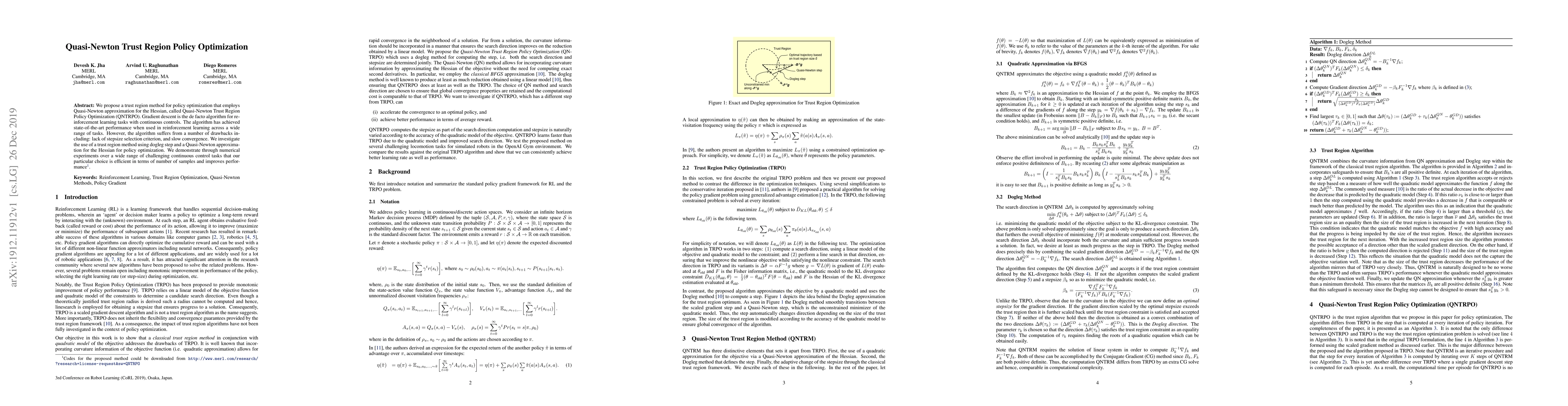 This paper introduces Quasi-Newton Trust Region Policy Optimization (QNTRPO), a trust region method for policy optimization that uses a Quasi-Newton approximation for the Hessian. It aims to address the drawbacks of gradient descent, such as lack of stepsize selection and slow convergence, demonstrating improved efficiency and performance in continuous control tasks.